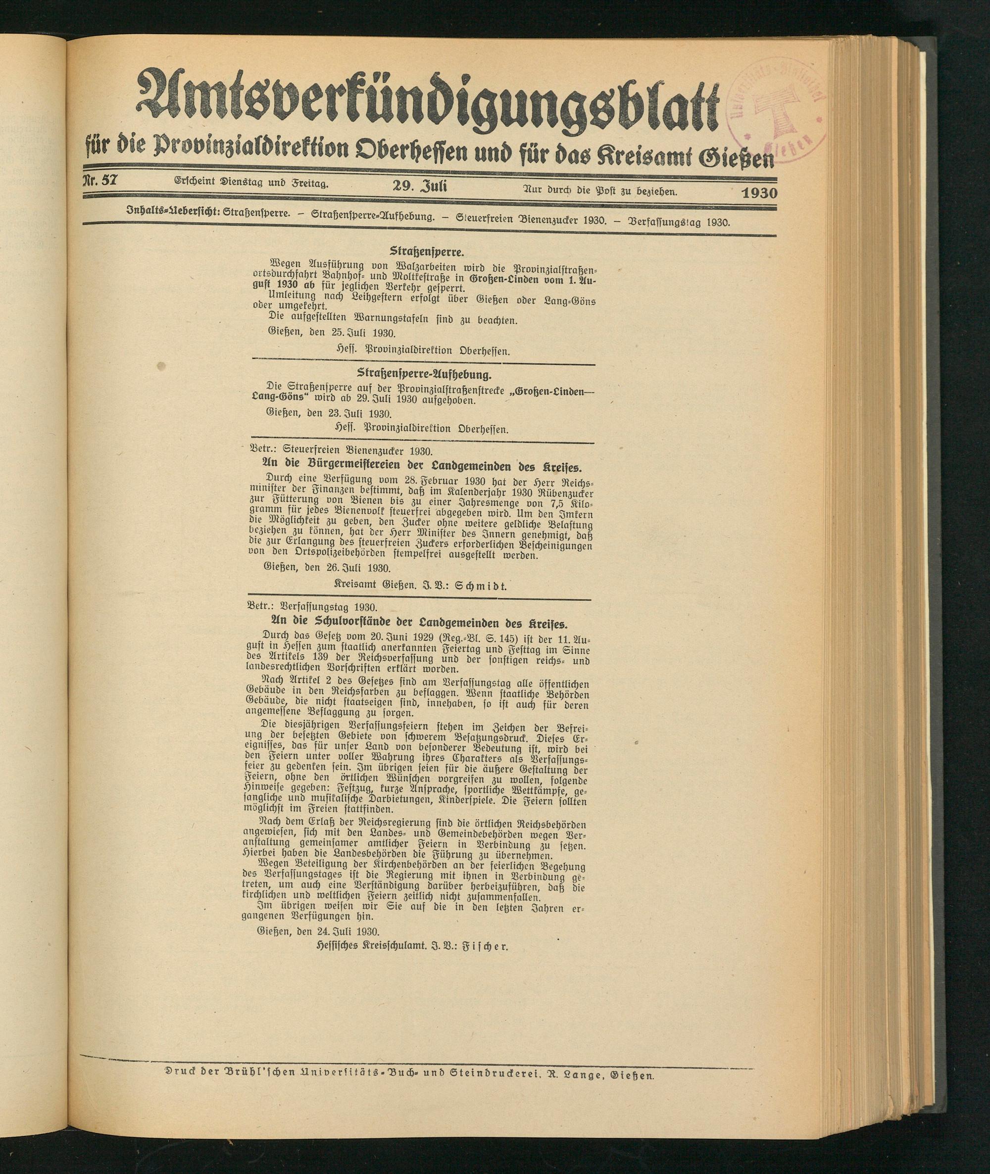 Durch das Gesetz vom 20. Juni 1929 (Reg.-Bl. 6.145) ist der 11. Au- Zust in Hessen zum staatlich anerkannten Feiertag und Festtag im Sinne des Artikels 139 der Reichsverfassung und der sonstigen reichs- und landesrechtlichen Vorschriften erklärt worden.