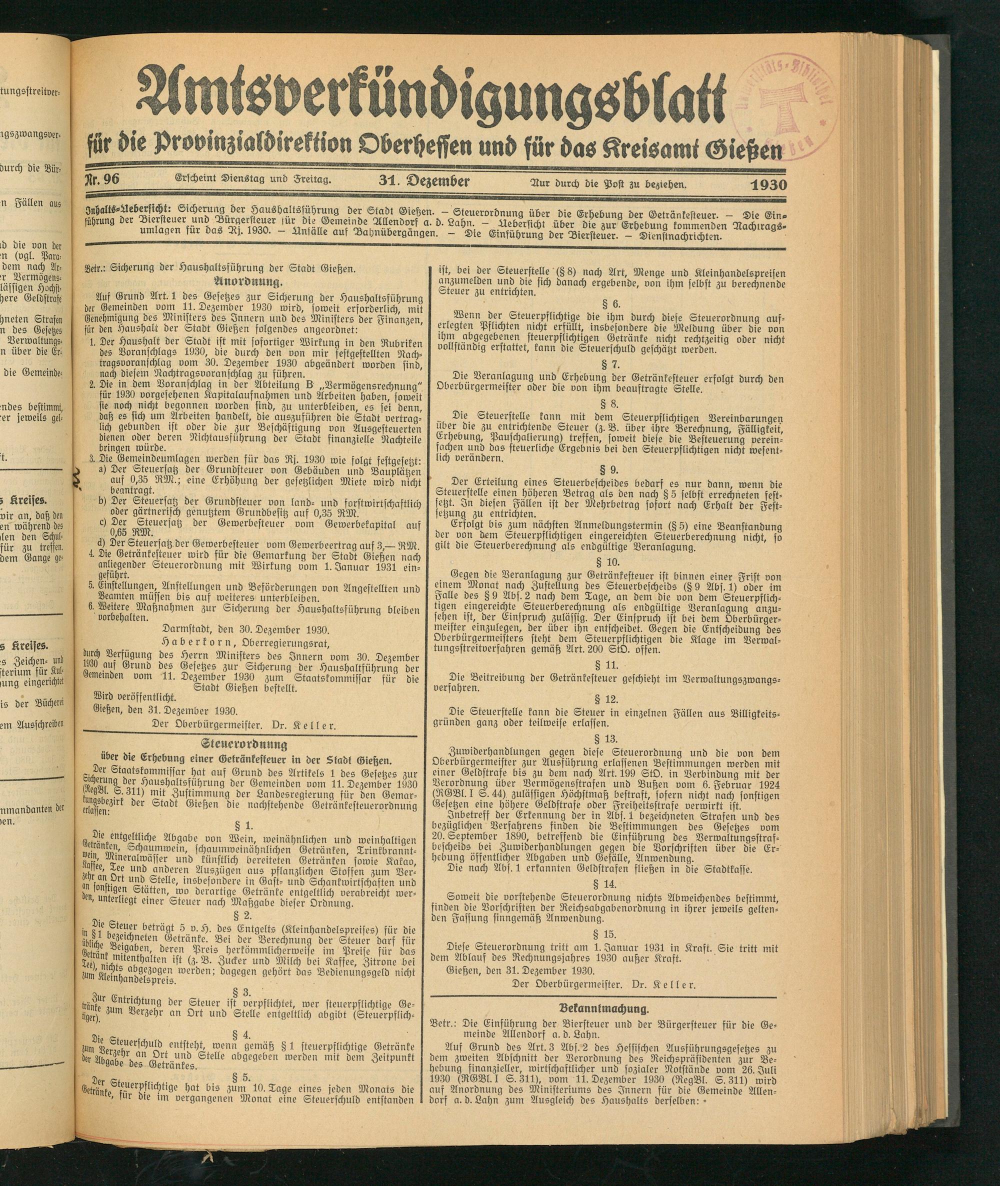 4. Die Getränkesteuer wird für die Gemarkung der Stadt Gießen nach anliegender Steuerordnung mit Wirkung vom 1. Januar 1931 ein« geführt.