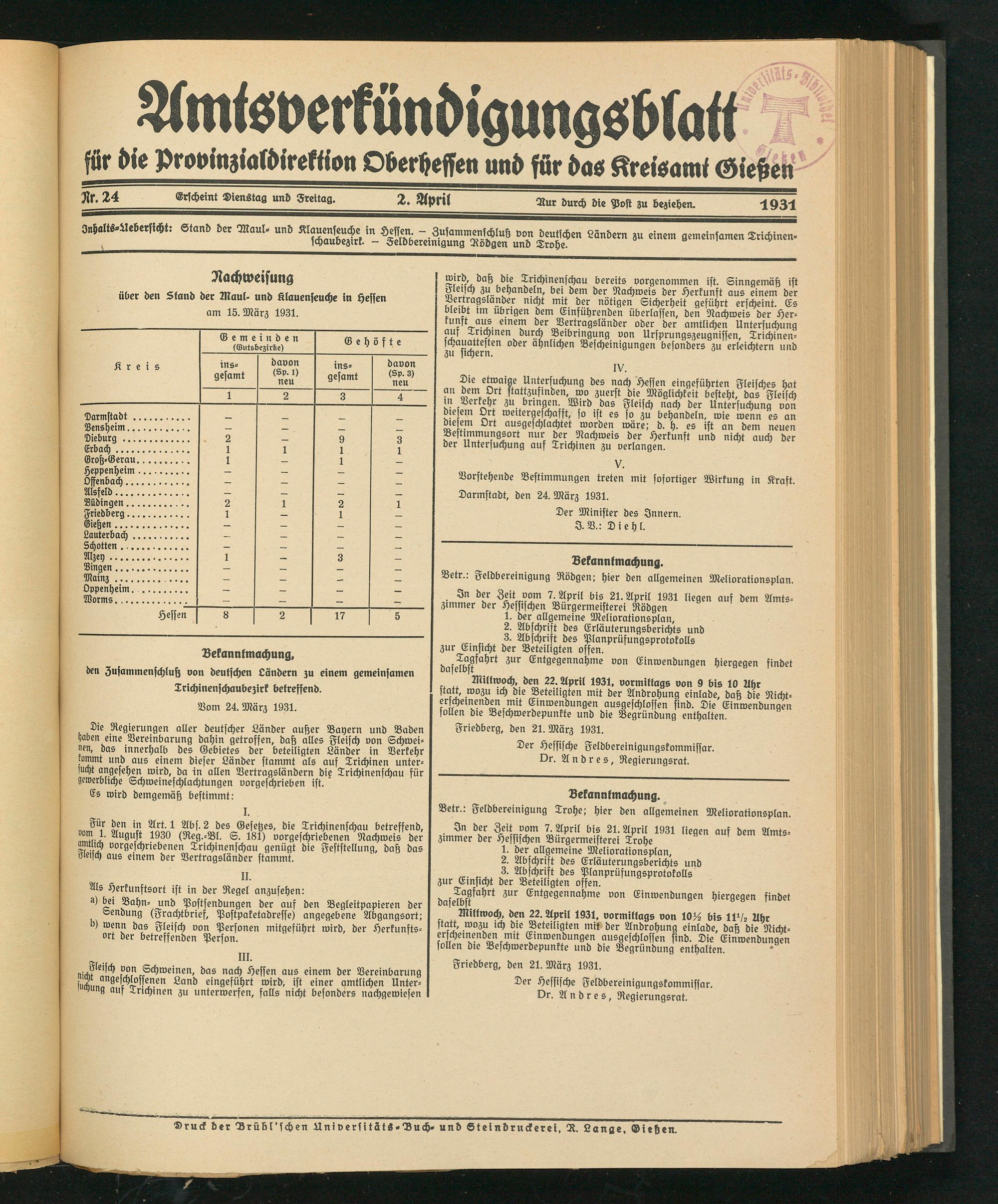 Amtsverkündigungsblatt W für -ie Provinzialdirektton Oberheffen und für das Kreisami Gießen