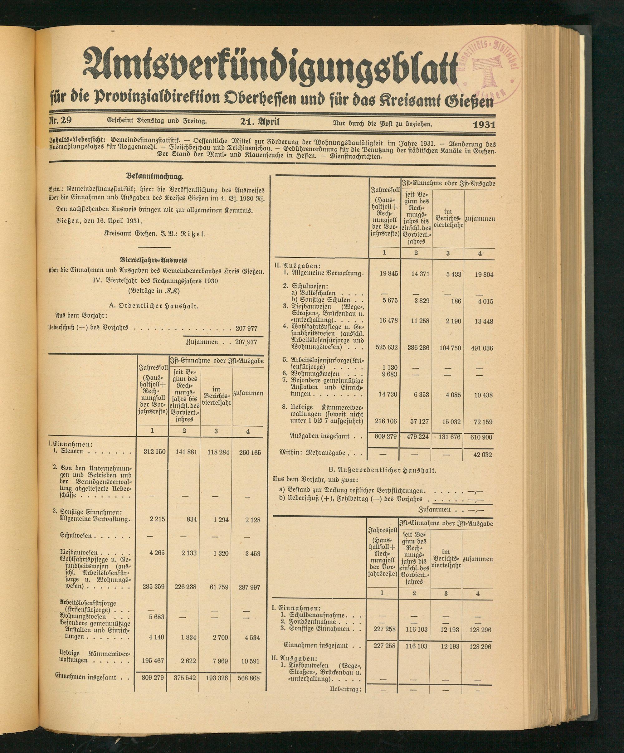 Betr.: Gemeindefinanzstatistik; hier: die Veröffentlichung des Ausweises über die Einnahmen und Ausgaben des Kreises Gießen im 4. Vj. 1930 Rj.