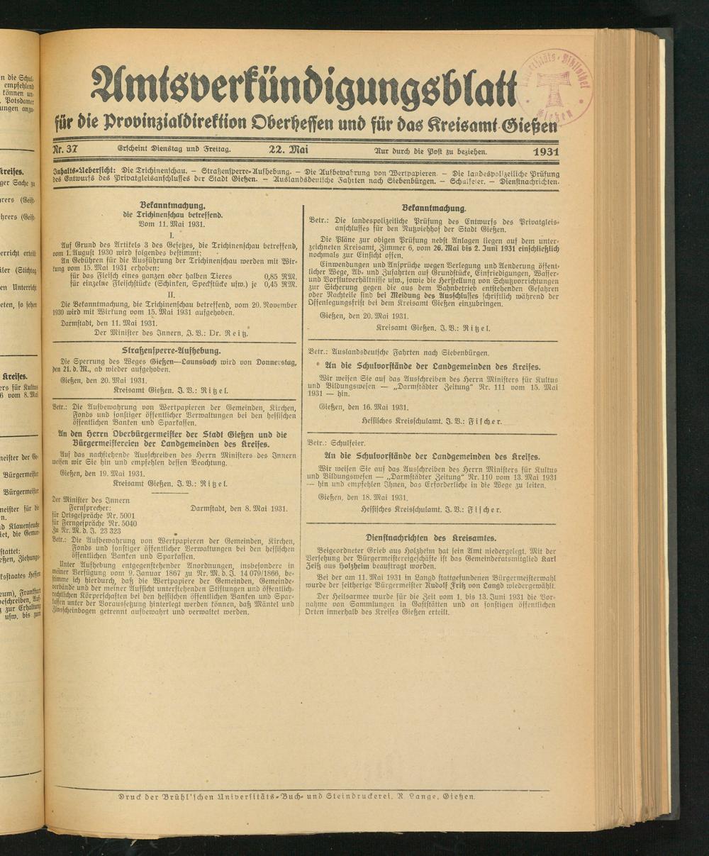 Wir weisen Sie auf das Ausschreiben des Herrn Ministers für Kultus und Bildungswesen — „Darmstädter Zeitung" Nr. 110 vom 13. Mai 1931 — hin und empfehlen 3hnen, das Erforderliche in die Wege zu leiten.