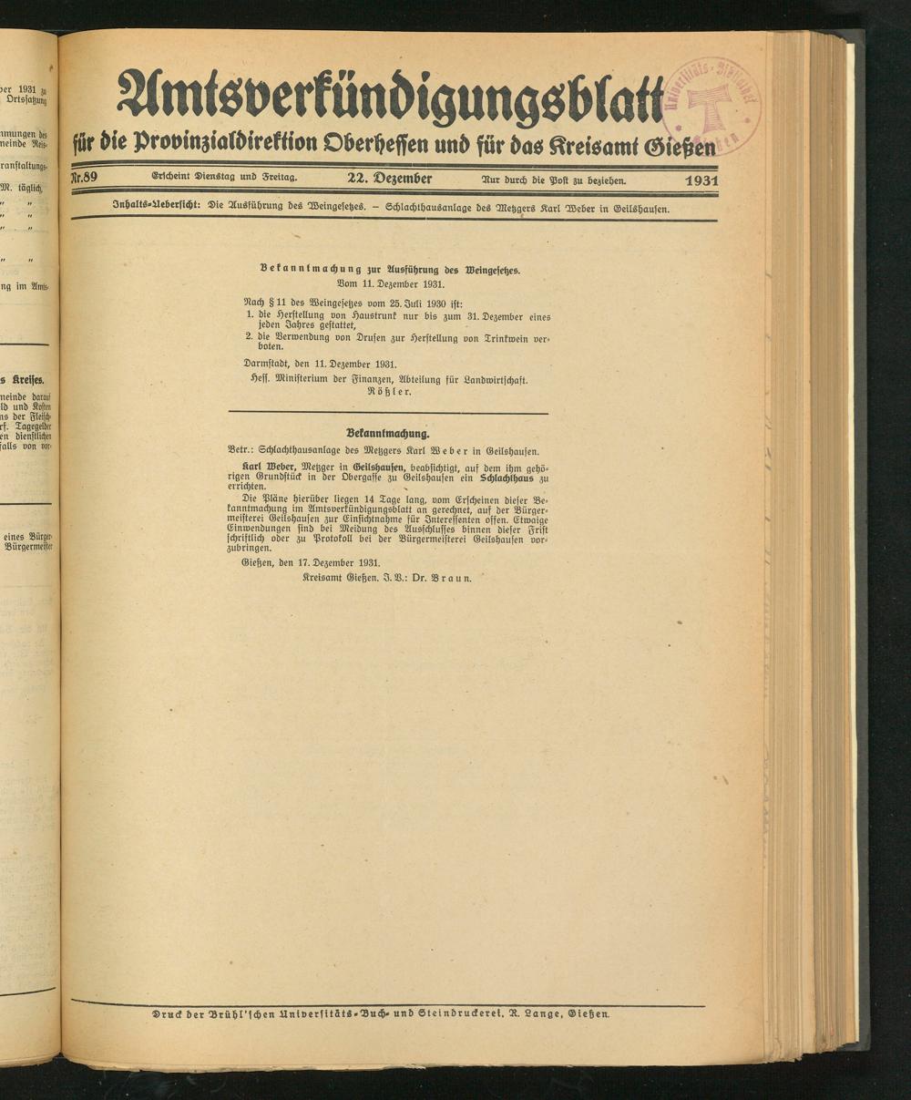 Kreisamt Gießen. I. V.: Dr. Braun.