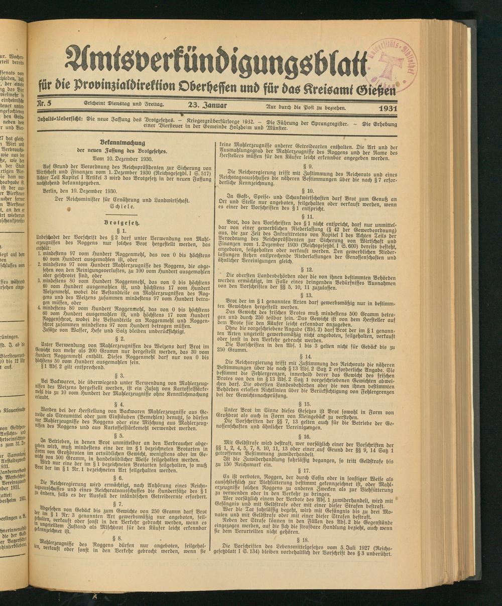 Auf Grund der Verordnung des Reichspräsidenten zur Sicherung von Wirtschaft und Finanzen vom 1. Dezember 1930 (Reichsgesetzbl I S 517) Achter Teil Kapitel I Artikel 3 wird das Brotgesetz in der neuen Fassung nachstehend bekanntgegeben.