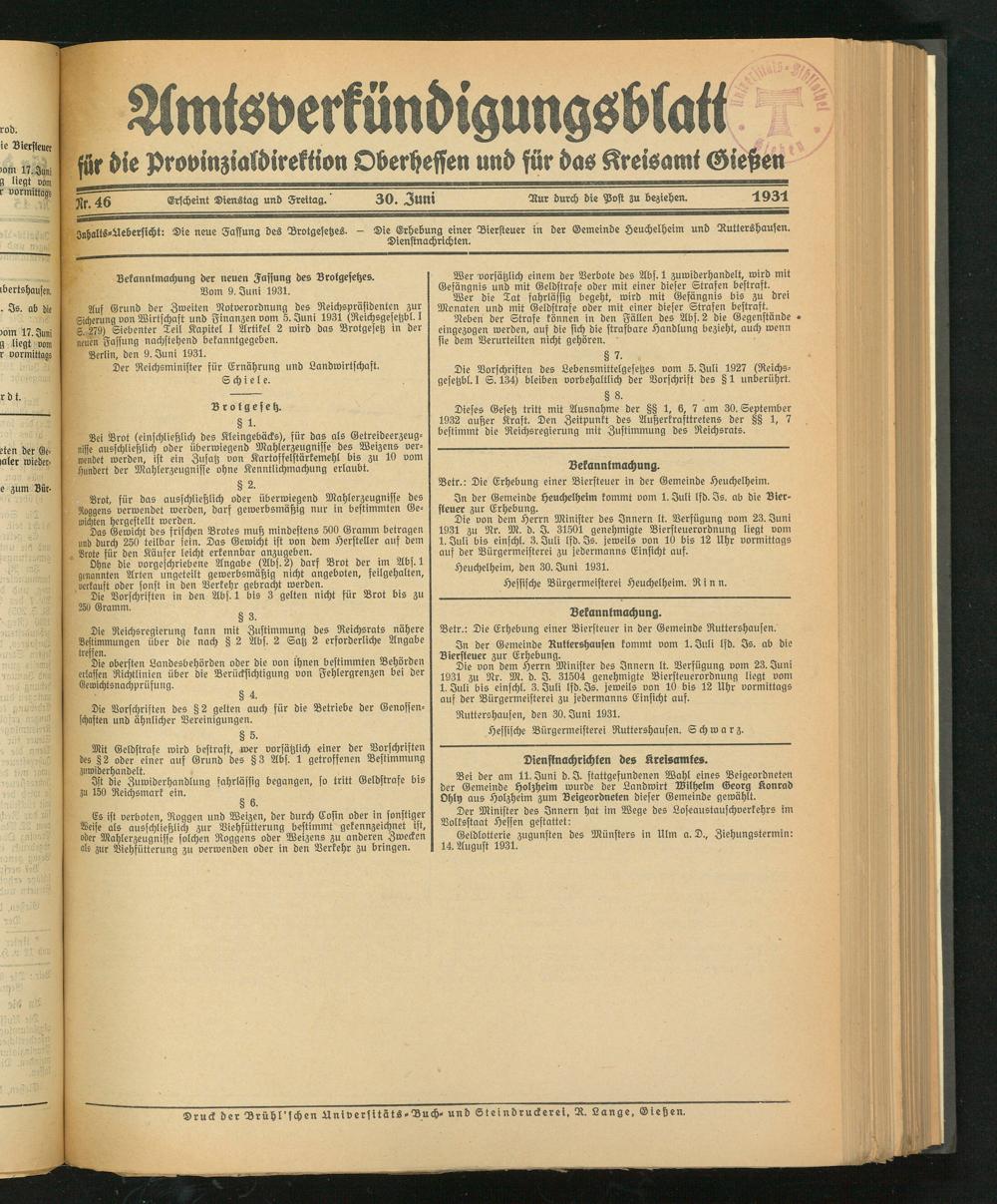 :: Die neue Fassung des Brotgesetzes. - Die Erhebung einer Biersteuer in der Gemeinde Heuchelheim und Ruttershausen. Dienstnachrichten.