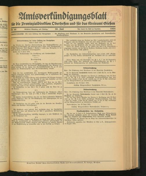 fgr die Provinzialdirektion Oberheffen und für das Kreisamt Gießen