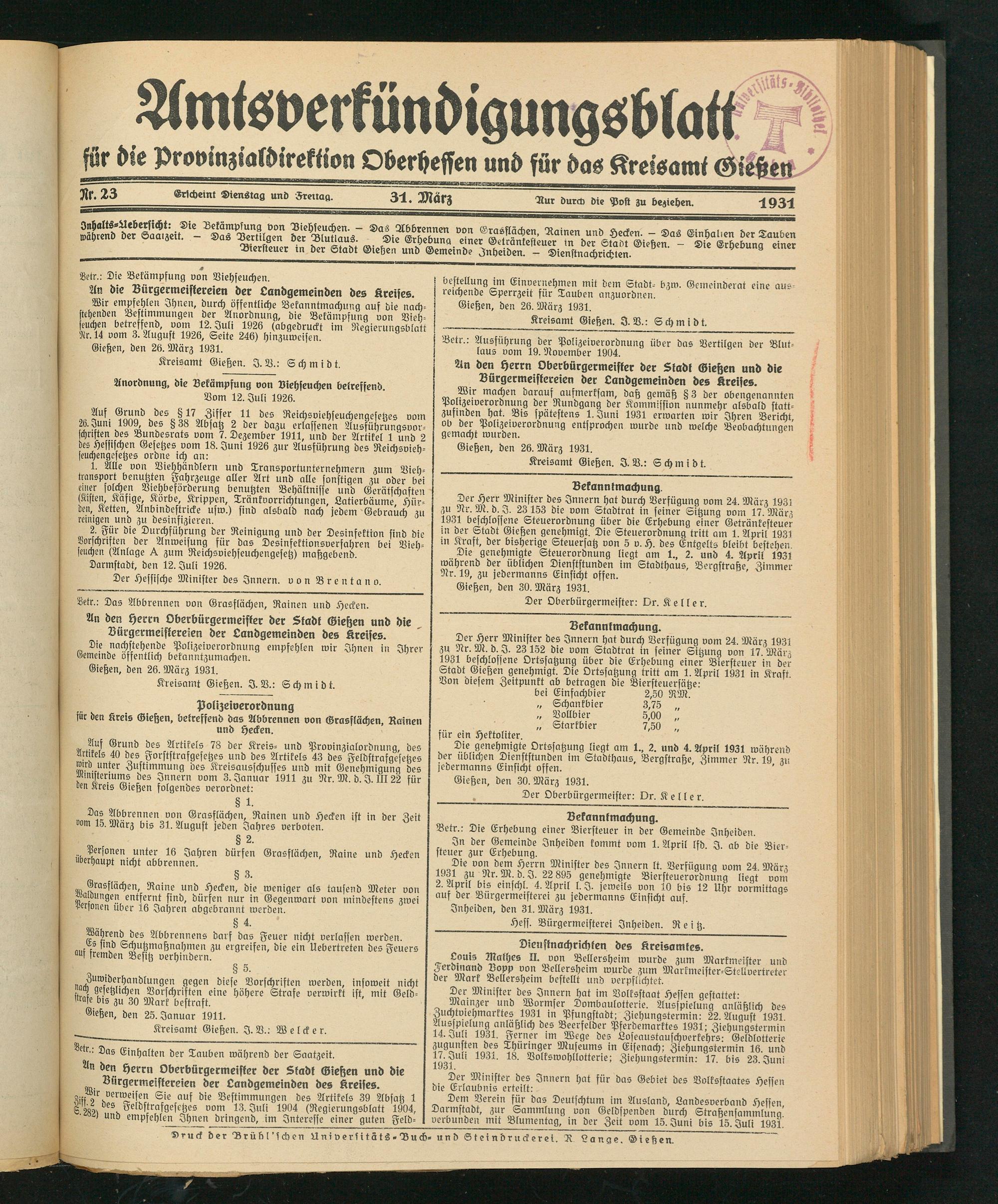 Der Herr Minister des 3nnern hat durch Verfügung vom 24. März 1931 8U Nr. M. d. I. 23153 die vom Stadtrat in seiner Sitzung vom 17 Mär- 1931 beschlossene Steuerordnung über die Erhebung einer Getränkesteuer in der Stadt Gießen genehmigt. Die Steuerordnung tritt am 1. April 1931 m Kraft, der bisherige Steuersatz von 5 v. H. des Entgelts bleibt bestehen