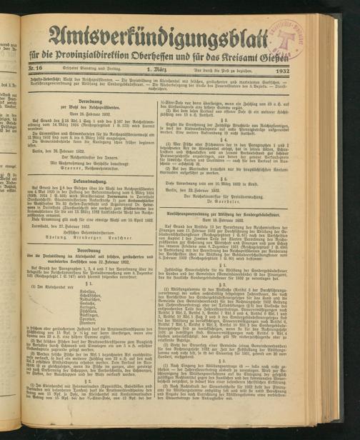 AmtsverkündigungsblatW für die Provinzialdirektion Oberheffen und für das Kreisamt GieW fr- 16 grtct,eint Diens'ag^ Freitag. Äur durch die ^st zu beziehen, 1932