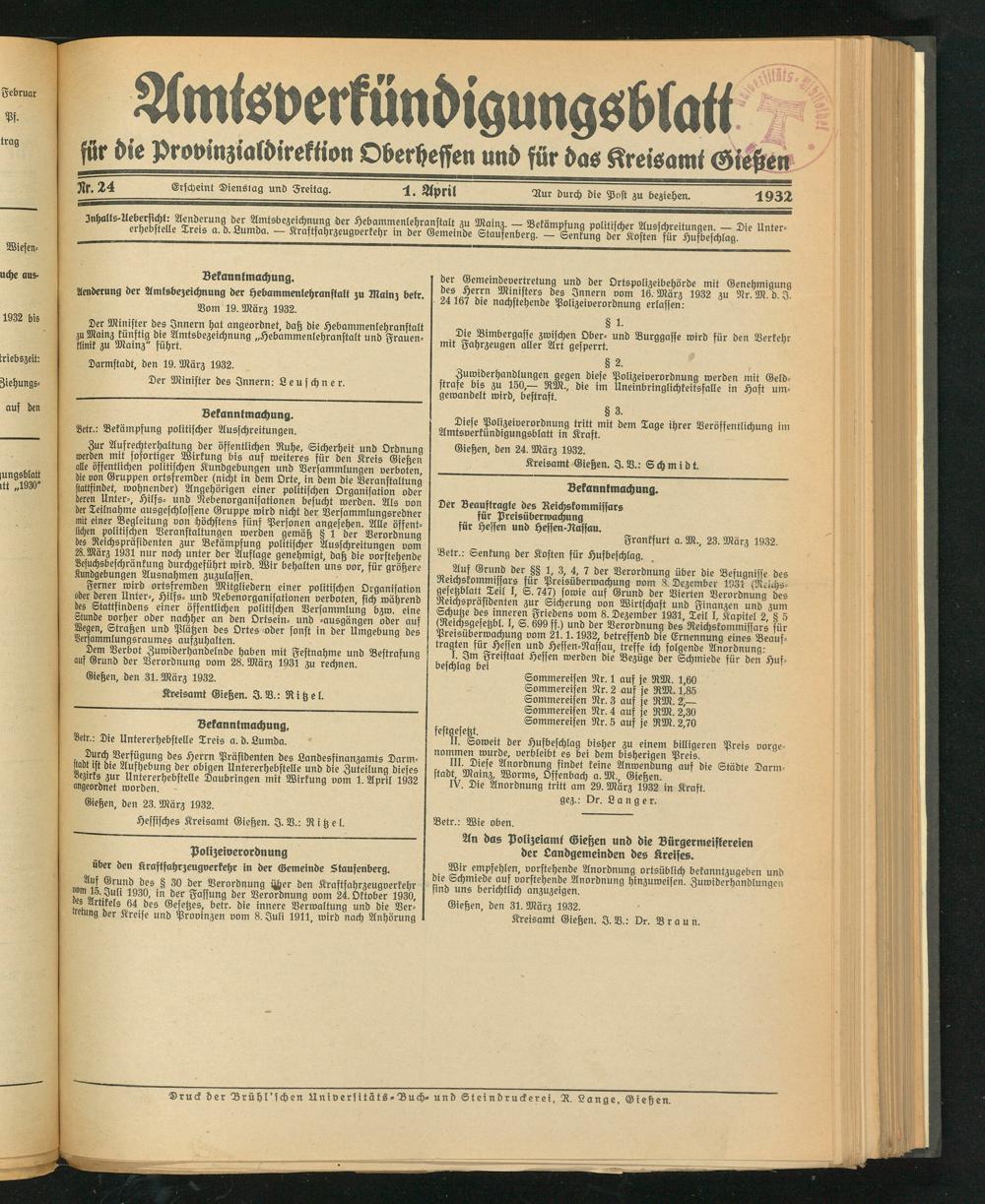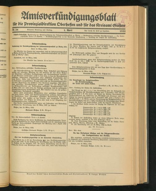 Amisverkündigungsblati für die provinzialdirettion Oberheffen und für das Kreisamt Gießen Ur. 24 scheint Diens.qg und Freitag. 4. April Bur durch die Post zu beziehen. 1932