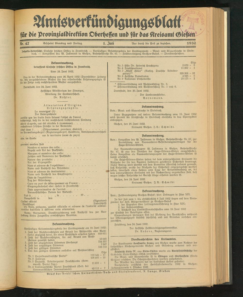 Inhaits-Ueberficht: Einfuhr frischen Obstes in Frankreich. — Vorläufiges Gesamtergebnis der Landtagswahl. - Maul- und Klauenseuche in Steinbach. — Konzession des W. Jullmann in Gießen. Bahnhofstraße Nr. 67. — Feldbereinigung Großen-Buseck. — Dienstnachrichten.