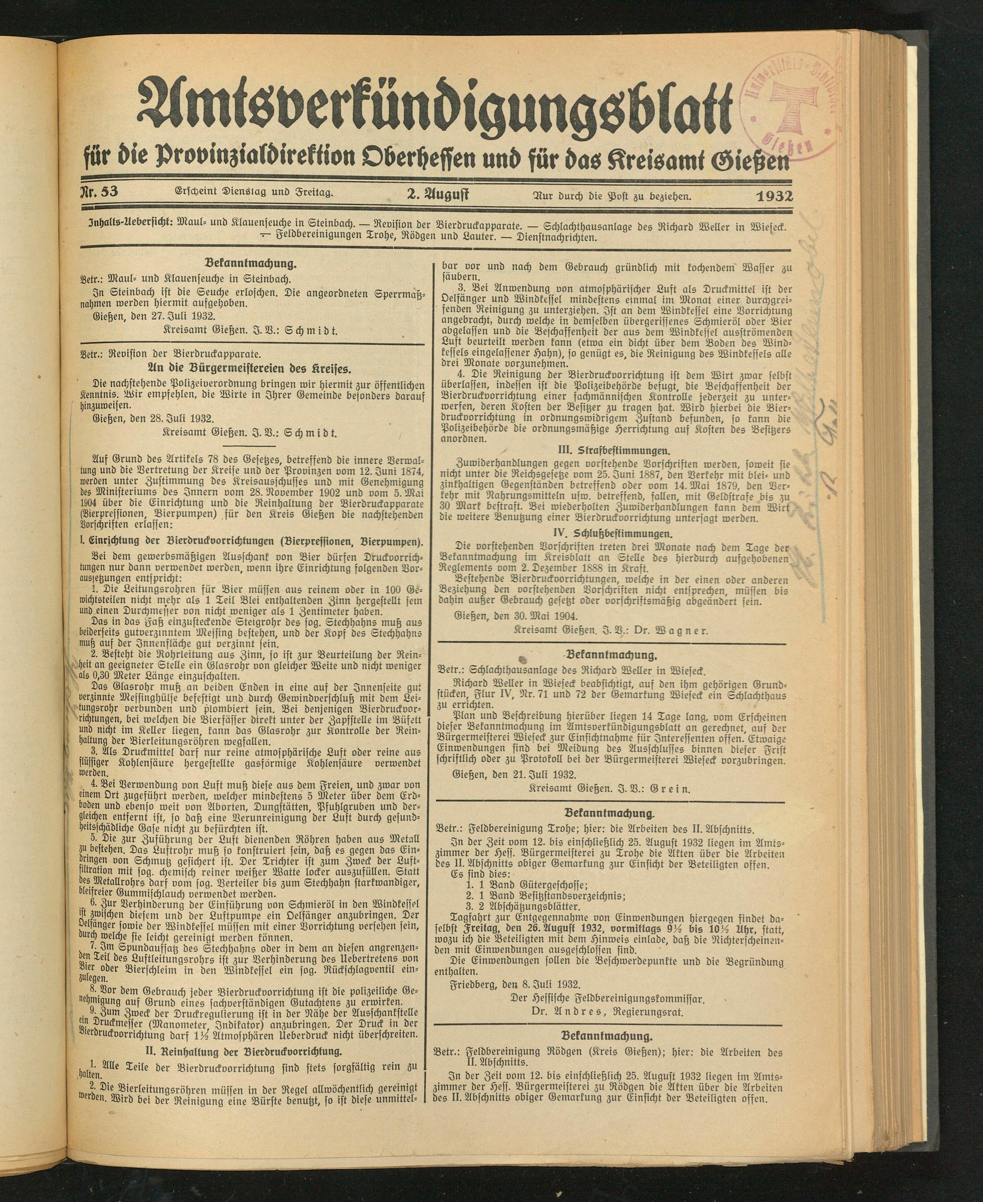 Inhalts-Uebersicht: Maul- und Klauenseuche in Steinbach. — Revision der Bierdruckapparate. — Schlachthausanlage des Richard Weller in Wieseck. Feldbereungungen Trohe, Rödgen und Lauter. — Dienstnachrichten.