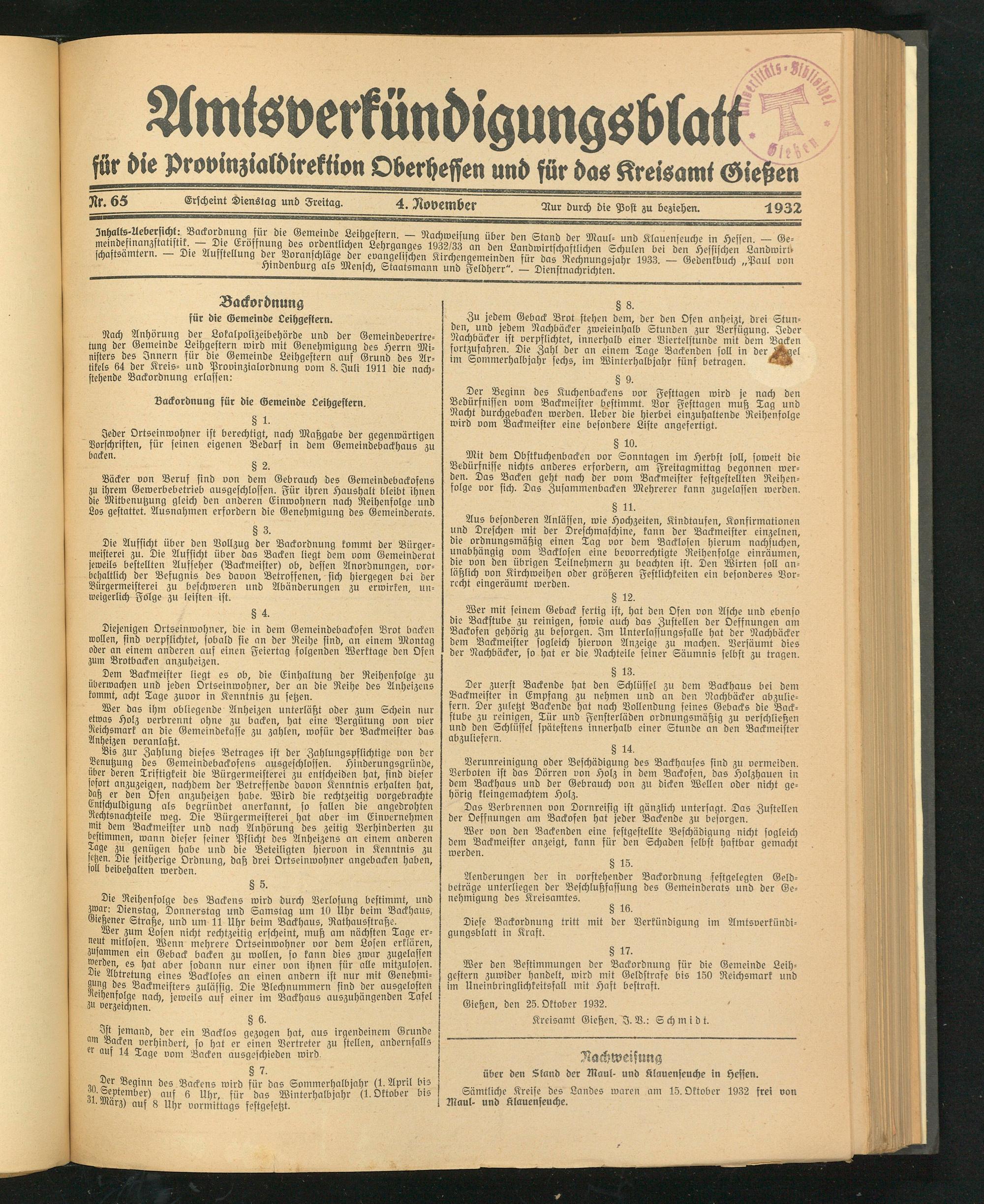 Inhalks-Uebersichk: Backordnung für die Gemeinde Leihgestern. — Nachweisung über den Stand der Maul- und Klauenseuche in Liessen — Ge- ÄmS®te“ÄÄ Lehrgänge- 1932/33 an den Landwirtschaftlichen Schulen be7hessischen Landwkru