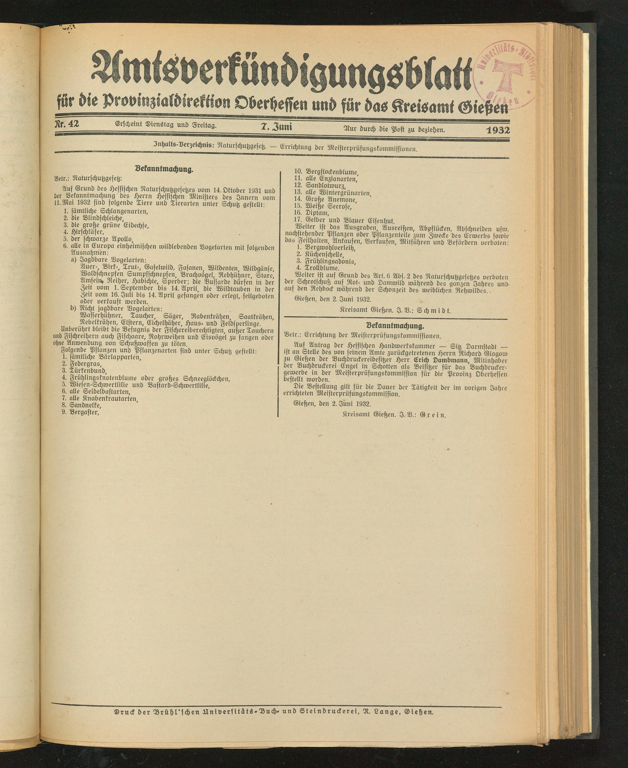 Auf Grund des Hessischen Naturschutzgesetzes vom 14. Oktober 1931 und der Bekanntmachung des Herrn Hessischen Ministers des Innern vom 11. Mai 1932 find folgende Tiere und Tierarten unter Schutz gestellt: