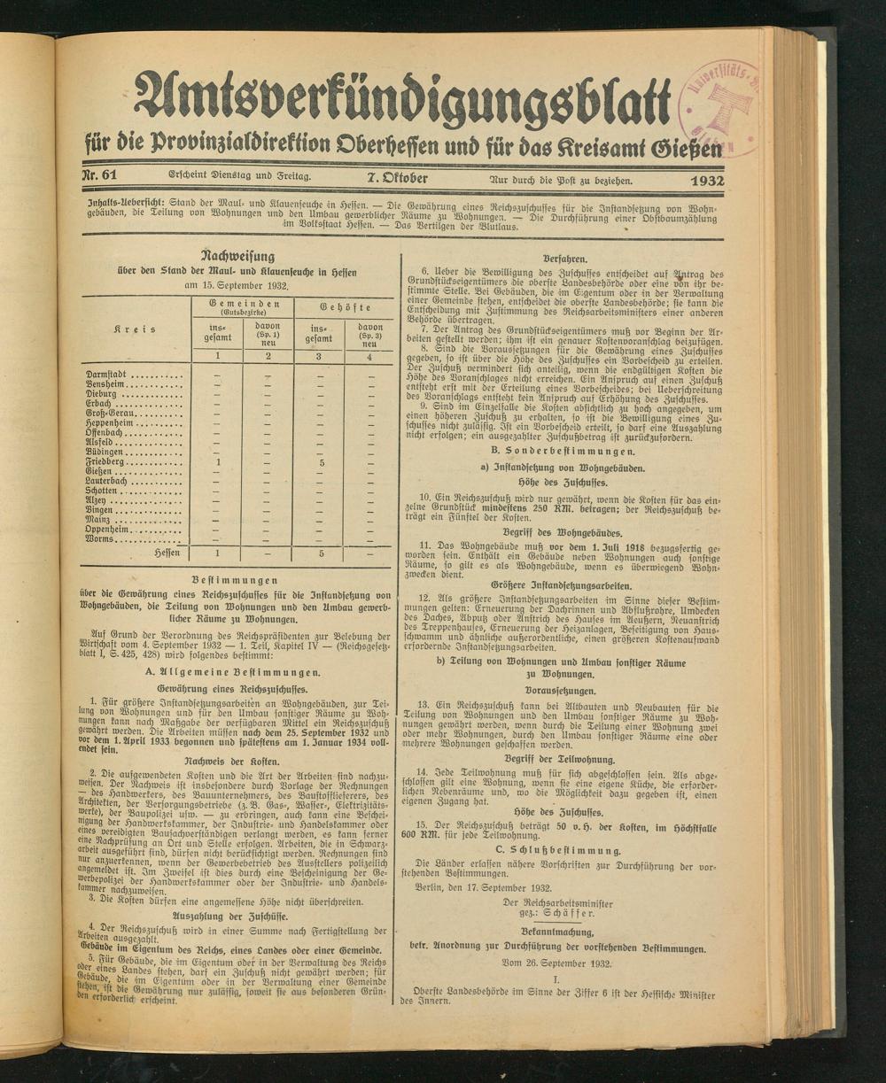Amtsverkündigungsblait Ö für die provinzial-irektion Oberheffen und für das Kreisamt Gießen fr- 61 Erscheint Dienstag und Freitag. 7. Oktober^" Rur durch die Post zu beziehen. 1932