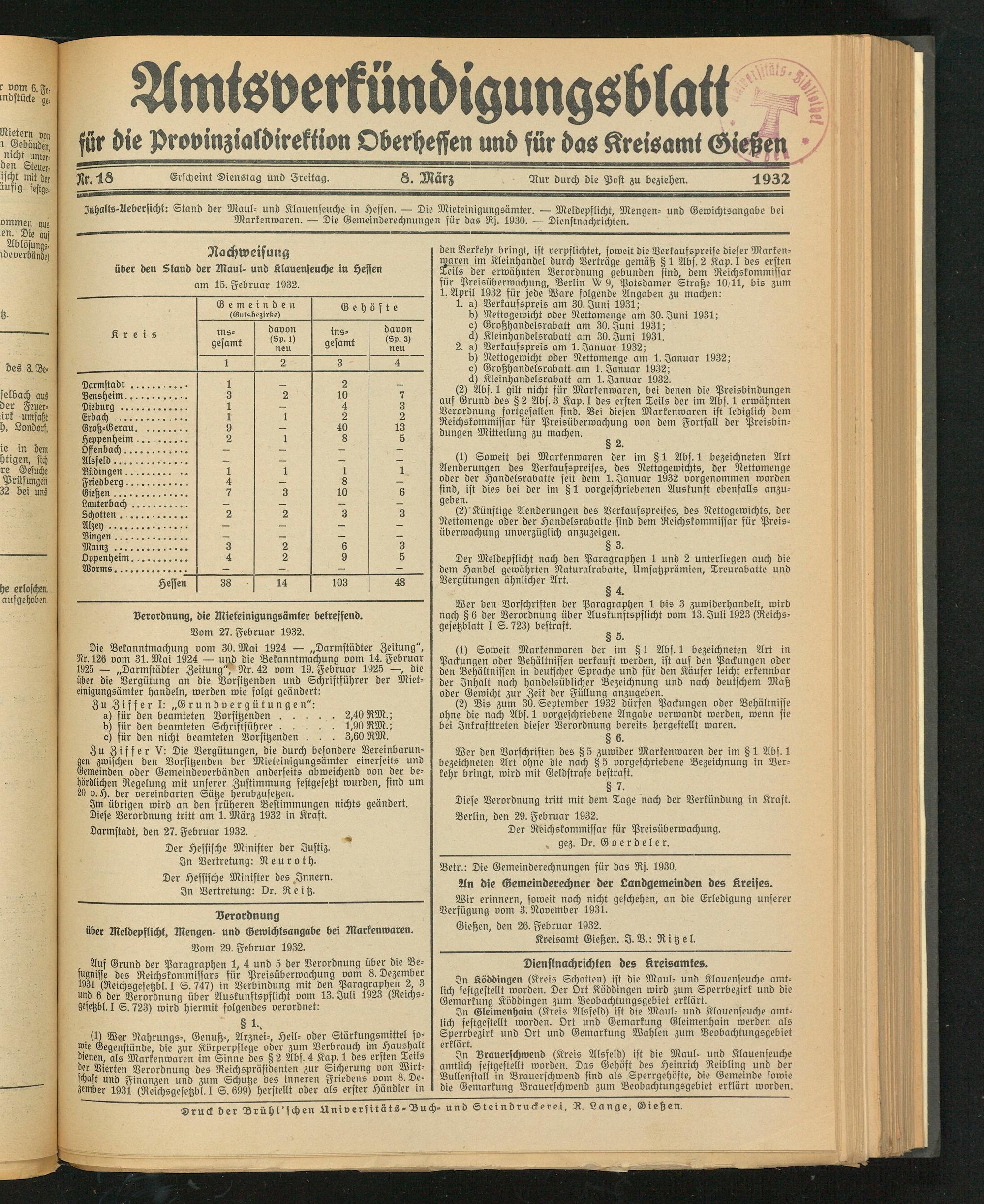 Inhalks-Uebersicht: Stand der Maul- und Klauenseuche in Hessen. — Die Mieteinigungsämter. — Meldepflicht, Mengen- und Gewichtsangabe bei Markenwaren. — Die Gemeinderechnungen für das Rj. 1930. — Dienstnachrichten.
