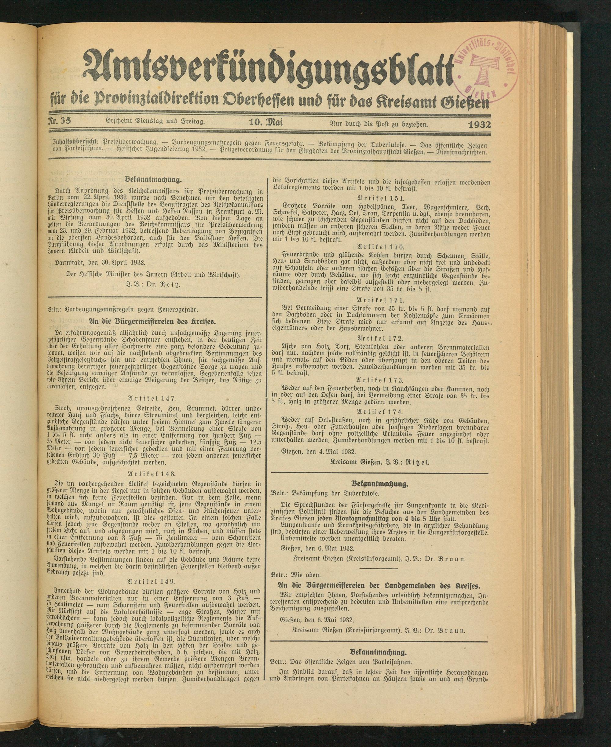 rnhalksübersichk: Preisüberwachung. — Vorbeugungsmaßregeln gegen Feuersgefahr. - Bekämpfung der Tuberkulose. - Das öffentliche deinen von charteifahnen. Hessischer ^ugendfeiertag 1932. — Polizeiverordnung für den Flughafen der Provinzialhauptstadt Gießen. — Dienstnachrichten.