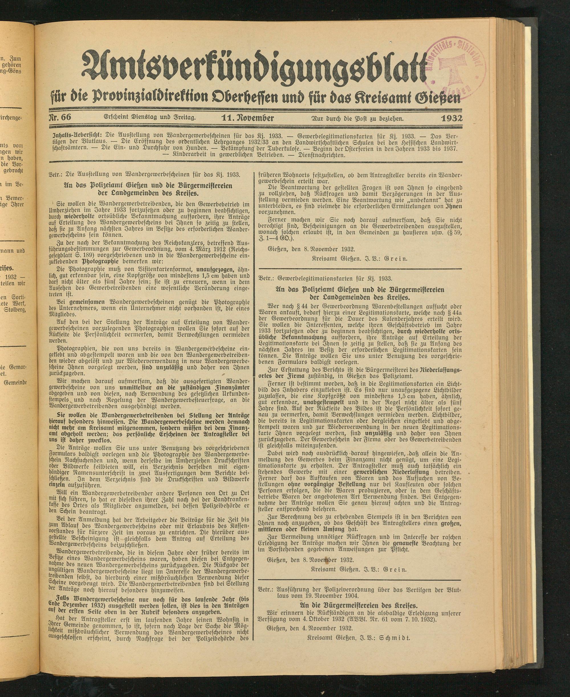 Inhalls-Uebersicht: Die Ausstellung von Wandergewerbescheinen für das Kj. 1933. — Gewerbelegitimationskarten für Kj. 1933. — Das Vertilgen der Blutlaus. — Die Eröffnung des ordentlichen Lehrganges 1932/33 an den Landwirtschaftlichen Schulen bei den Hessischen Landwirt- schaftsamtern. — Die Ein- und Durchfuhr von Hunden. — Bekämpfung der Tuberkulose. — Beginn der Osterferien in den Jahren 1933 bis 1937. — Kinderarbeit in gewerblichen Betrieben. — Dienstnachrichten.