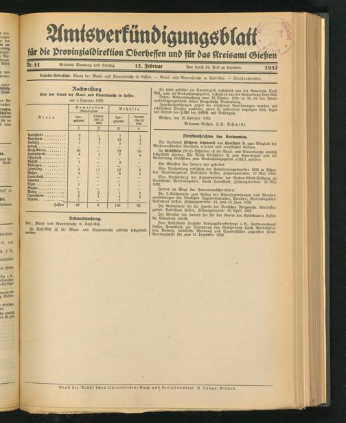 für die Provinzialdirektion Oberhessen und für das Kreisamt Gießen