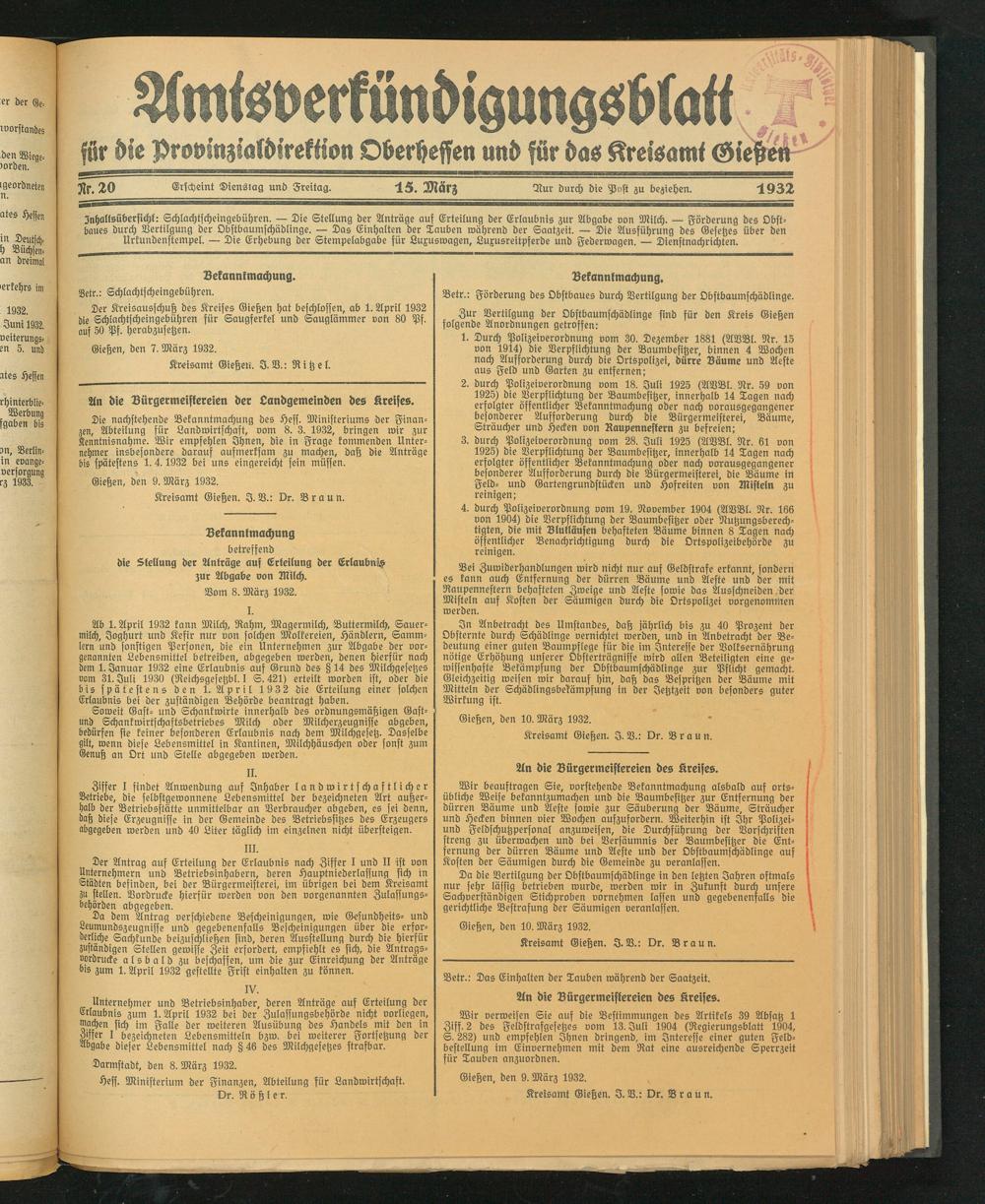 Kreisamt Gießen. I. V.: Dr. Braun.
