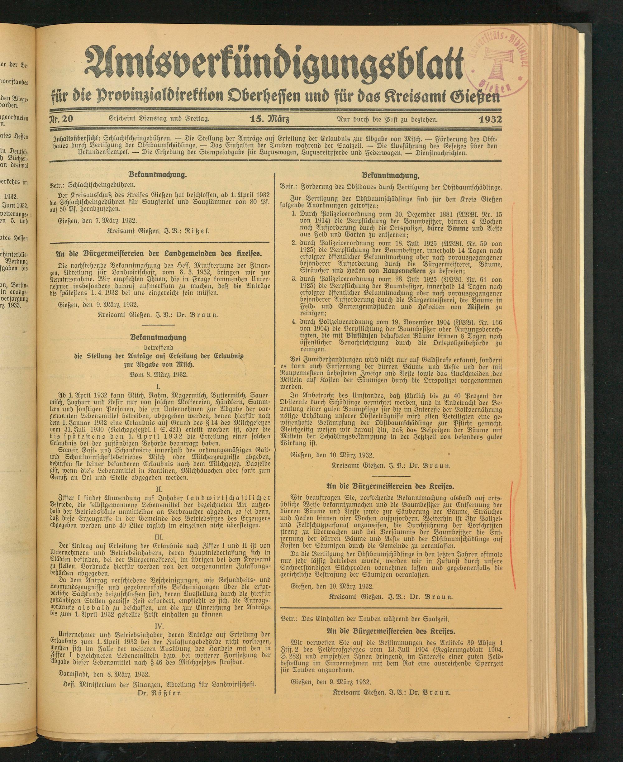 Inhaltsübersicht: Schlachtscheingebühren. — Die Stellung der Anträge auf Erteilung der Erlaubnis zur Abgabe von Milch. — Förderung des Obstbaues durch Vertilgung der Obstbaumschädlinge. — Das Einhalten der Tauben während der Saatzeit. — Die Ausführung des Gesetzes über den Urkundenstempel. — Die Erhebung der Stempelabgabe für Luxuswagen, Luxusreitpferde und Federwagen. — Dienstnachrichten.