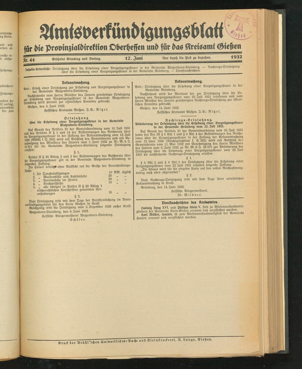 inbalis-Uebersicht: Ortssatzung über die Erhebung einer Vergnügungssteuer in der Gemeinde Watzenborn-Steinberg. — Nachtrags-Ortssatzung über die Erhebung einer Vergnügungssteuer in der Gemeinde Grunberg. — Dienstnachnchten._____________