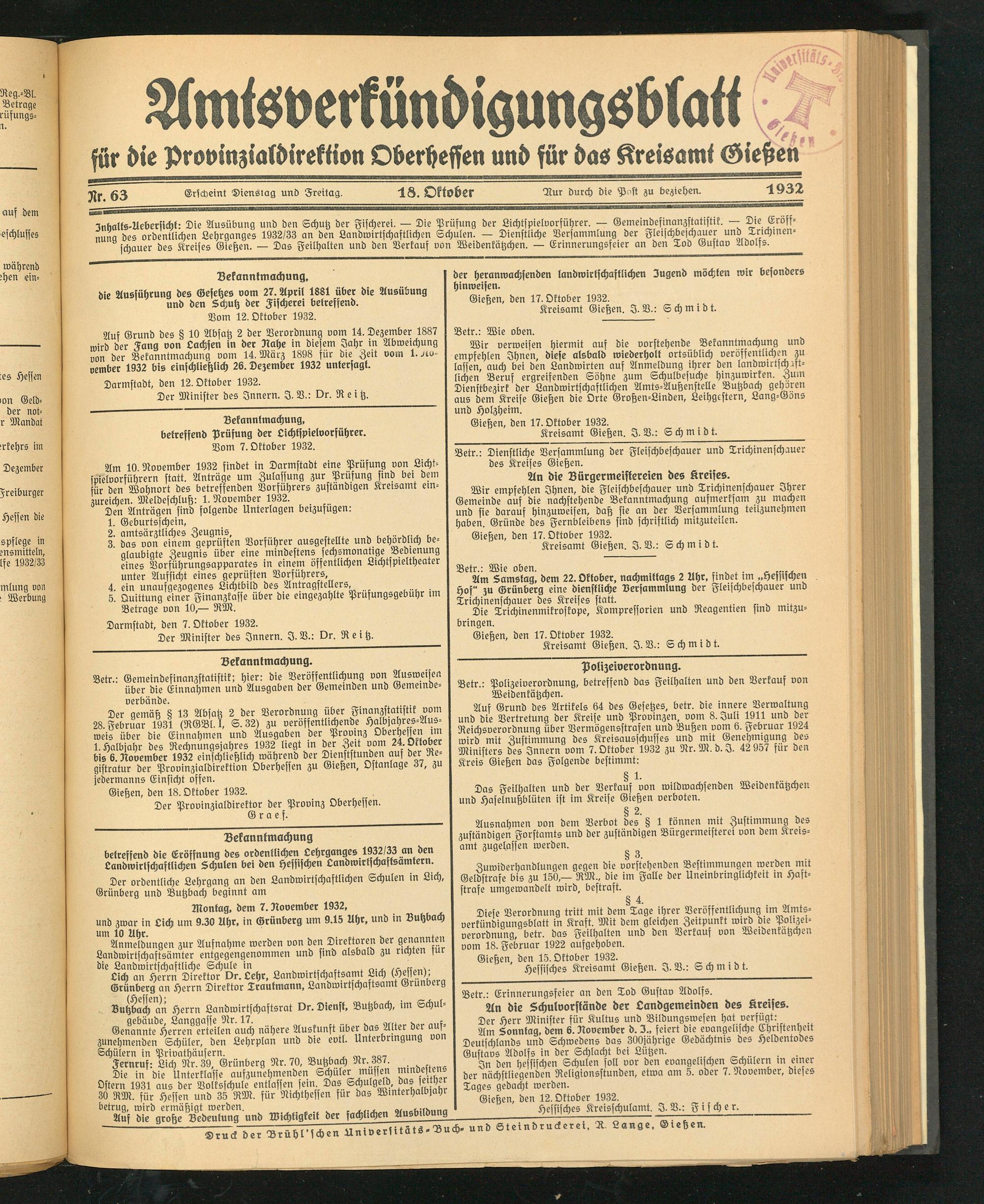 Inbalts-Uebersicht: Die Ausübung und den Schutz der Fischerei. — Die Prüfung der Lichtspielvorführer. — Gemeindefinanzstatistik. — Die Eroff- „unct ordentlichen Lehrganges 1932/33 an den Landwirtschaftlichen Schulen. — Dienstliche Versammlung der Fleischbeschauer und Trrchlnen- schauer des Kreises Gießen. — Das Feilhalten und den Verkauf von Weidenkätzchen. — Erinnerungsfeier an den Tod Gustav Adolfs.