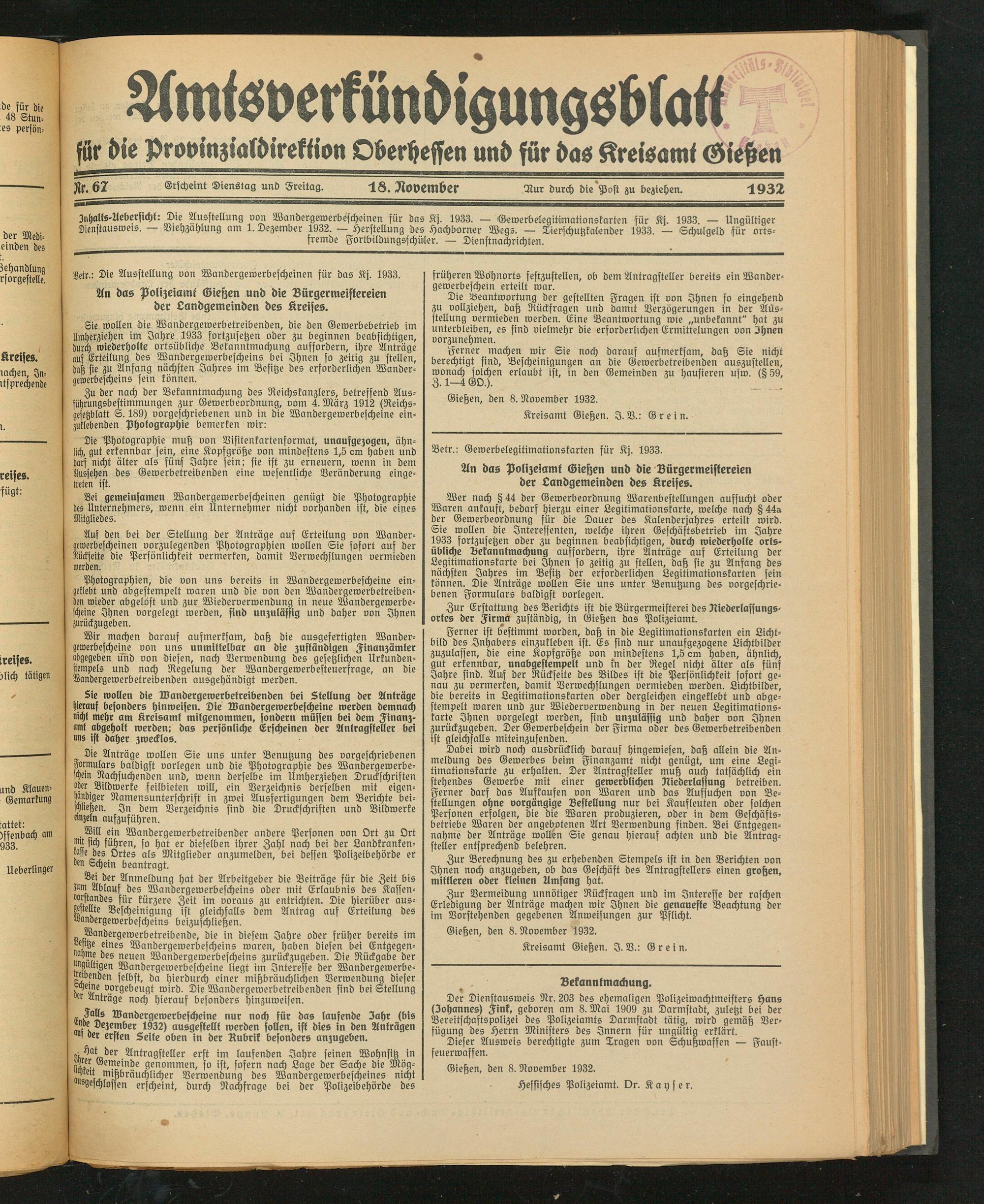 An das Polizeiamt Gießen und die Bürgermeistereien der Landgemeinden des Kreises.
