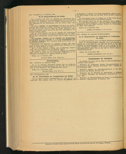 Wir empfehlen 3hnen, den auf Sie entfallenden Betrag alsbald an die Kreiskasse Gießen abzuführen. — Mit den bestellten Kalendern werden gleichzeitig die für 3hre Schule benötigten Abdrucke der Reichsverfajsung für Ostern 1933 ausgegeben.