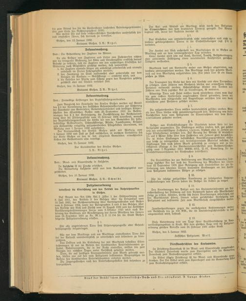 Auf Grund des Art. 129b Abs. 2 Ziffer 1 der Städteordnung vom 8. Juli 1911, des Artikels 3 des Gesetzes über die Ortspolizer vom 14. Juli 1921, der Reichsverordnung über Vermögensstrafen und Butzen vom 6. Februar 1924, sowie der Paragraphen 3 und 4 des Gesetzes über den Verkehr mit Vieh und Fleisch vom 10. August 1925 und der Hessischen Ausführungsbestimmungen hierzu vom 9. Oktober 1925 wird nach Anhörung des Stadtrats mit Genehmigung des Herrn Ministers des Innern vom 10. Dezember 1931 zu Nr. M. d. I. II 11154 für d,e Stadt Gießen folgende Polizeiverordnung erlassen.