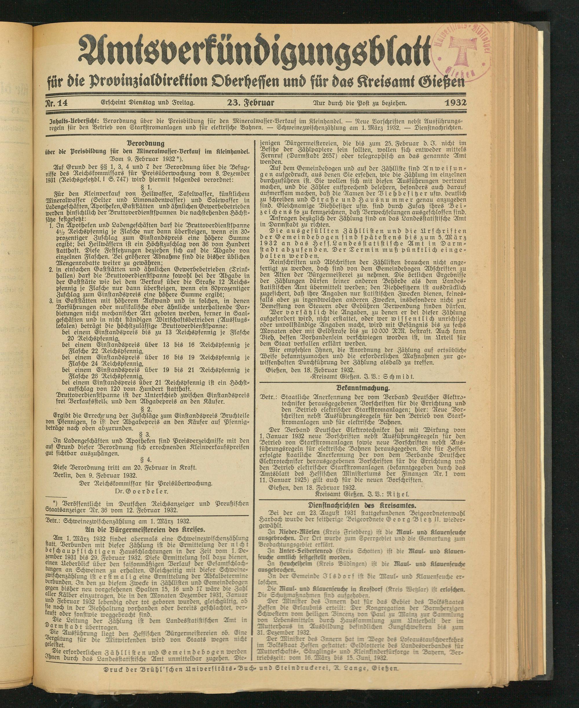 Jnhalts-llebersichk: Verordnung über die Preisbildung für den Mineralwasser-Verkauf im Kleinhandel. — Neue Vorschriften nebst Ausführungs- regeln für den Betrieb von Starkstromanlagen und für elektrische Bahnen. — Schweinezwischenzählung am 1. März 1932. — Dienstnachrichten.