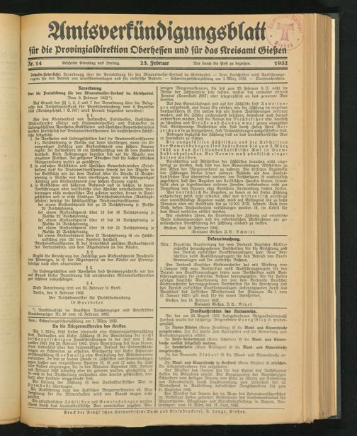 Amtsverkündigungsblatt D für die provinzialdirektion Oberheffen und für das Kreisamt Gießen