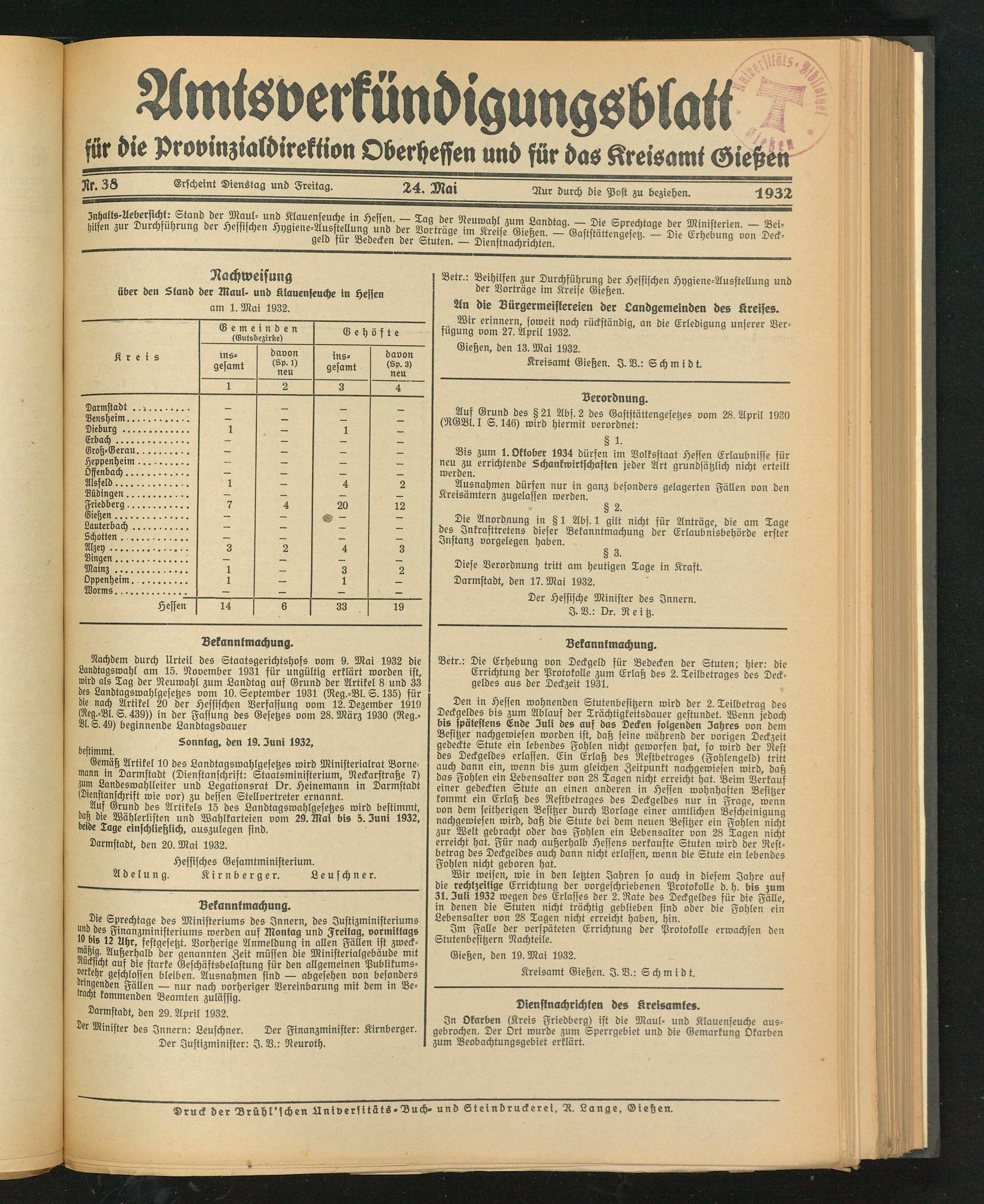 über den Stand der Maul- und Klauenseuche in Hessen am 1. Mai 1932.