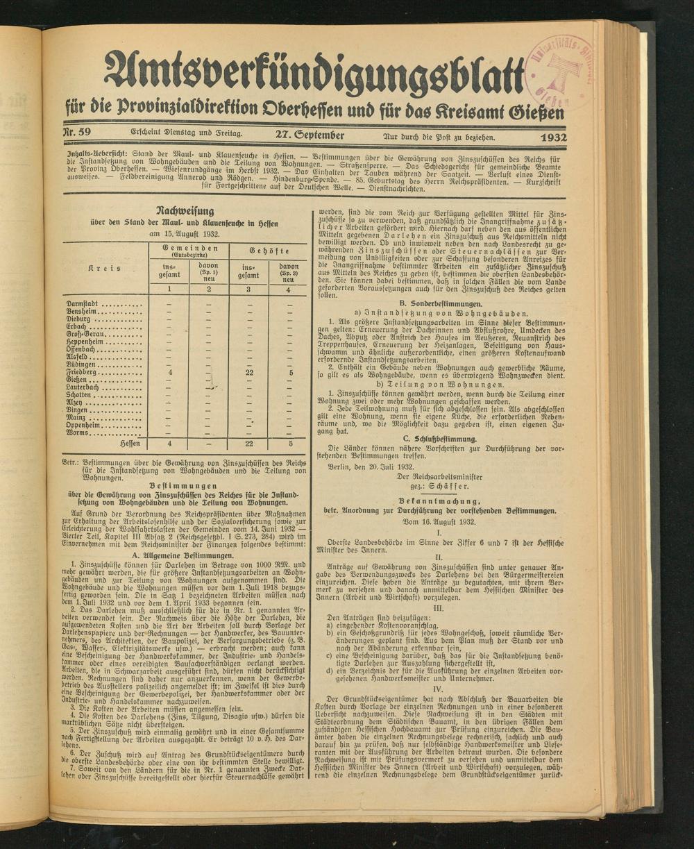 für die provinzial-irettion Oberheffen und für das Kreisamt Gießen