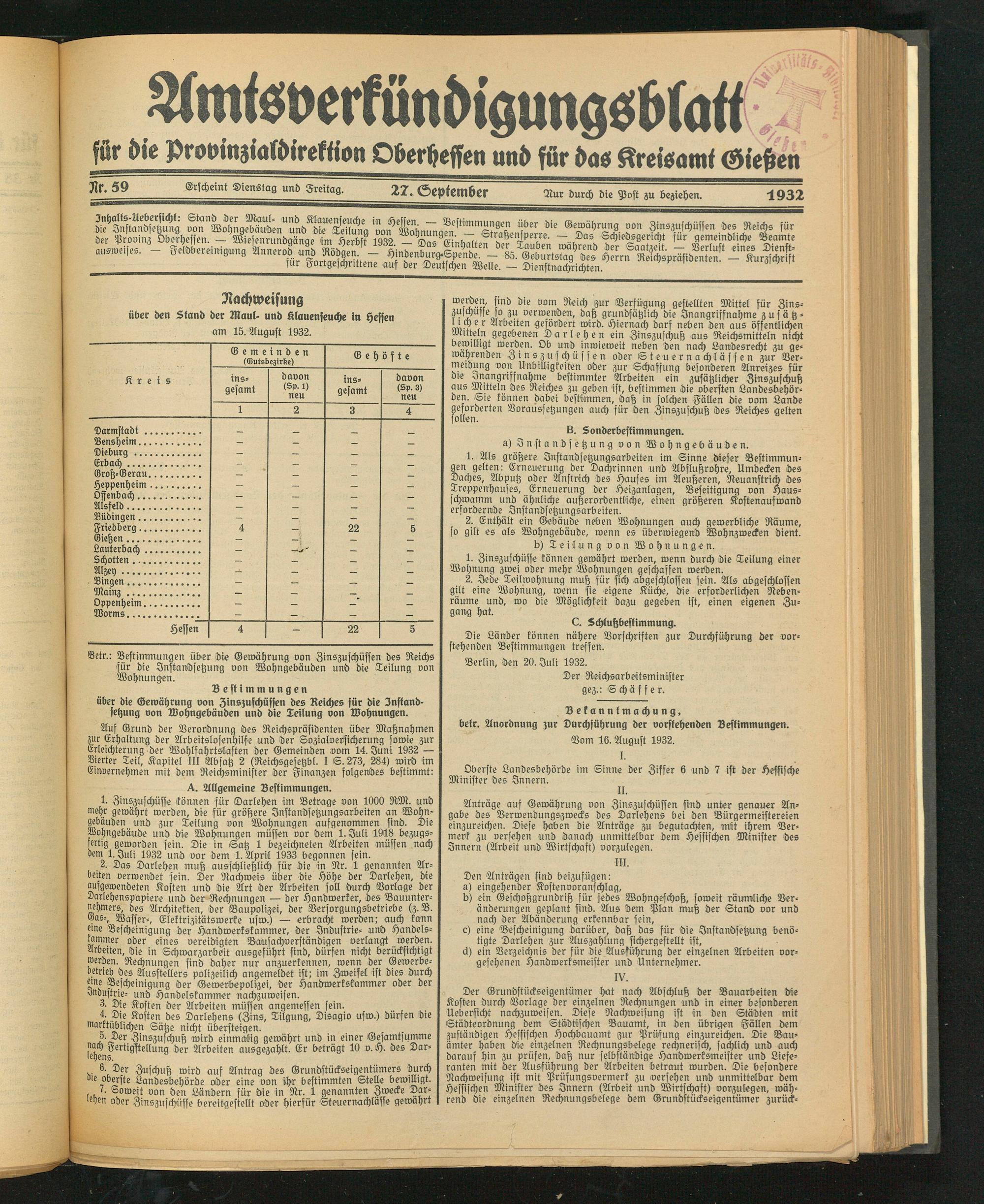 über den Stand der Maul, und Klauenseuche in Hessen am 15. August 1932.
