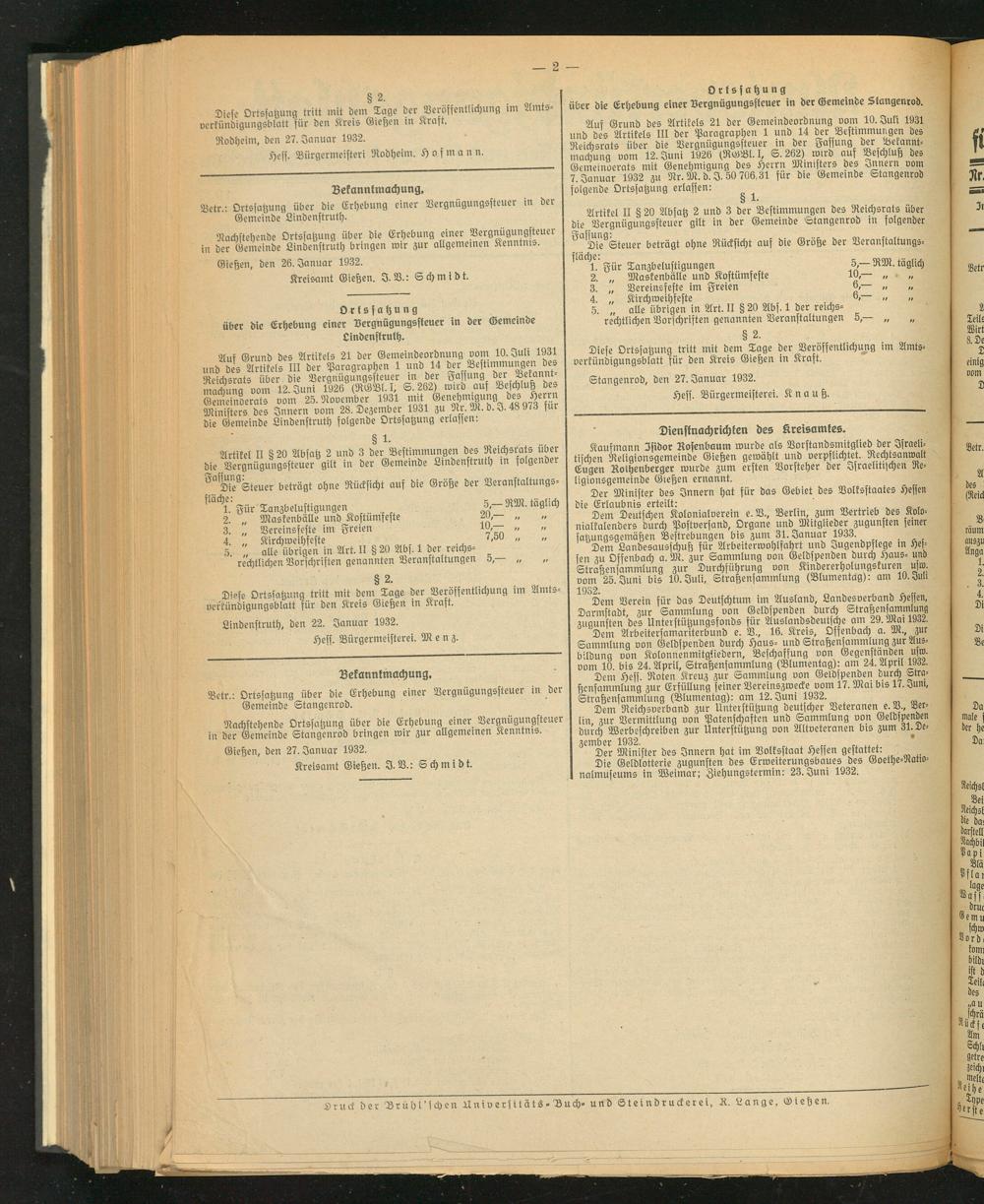 Auf Grund des Artikels 21 der Gemeindeordnung vom 10. Juli 1931 und des Artikels III der Paragraphen 1 und 14 der Bestimmungen des Reichsrats über die Vergnügungssteuer in der Fassung der Bekannt- mackuna vom 12. Juni 1926 (RGBl. I, S. 262) wird auf Beschluß des Gemeinderats vom 25. November 1931 mit Genehmigung des Herrn Ministers des Innern vom 28. Dezember 1931 zu Nr. M. d.J. 48 9,3 für die Gemeinde Lindenstruth folgende Ortssatzung erlaßen: