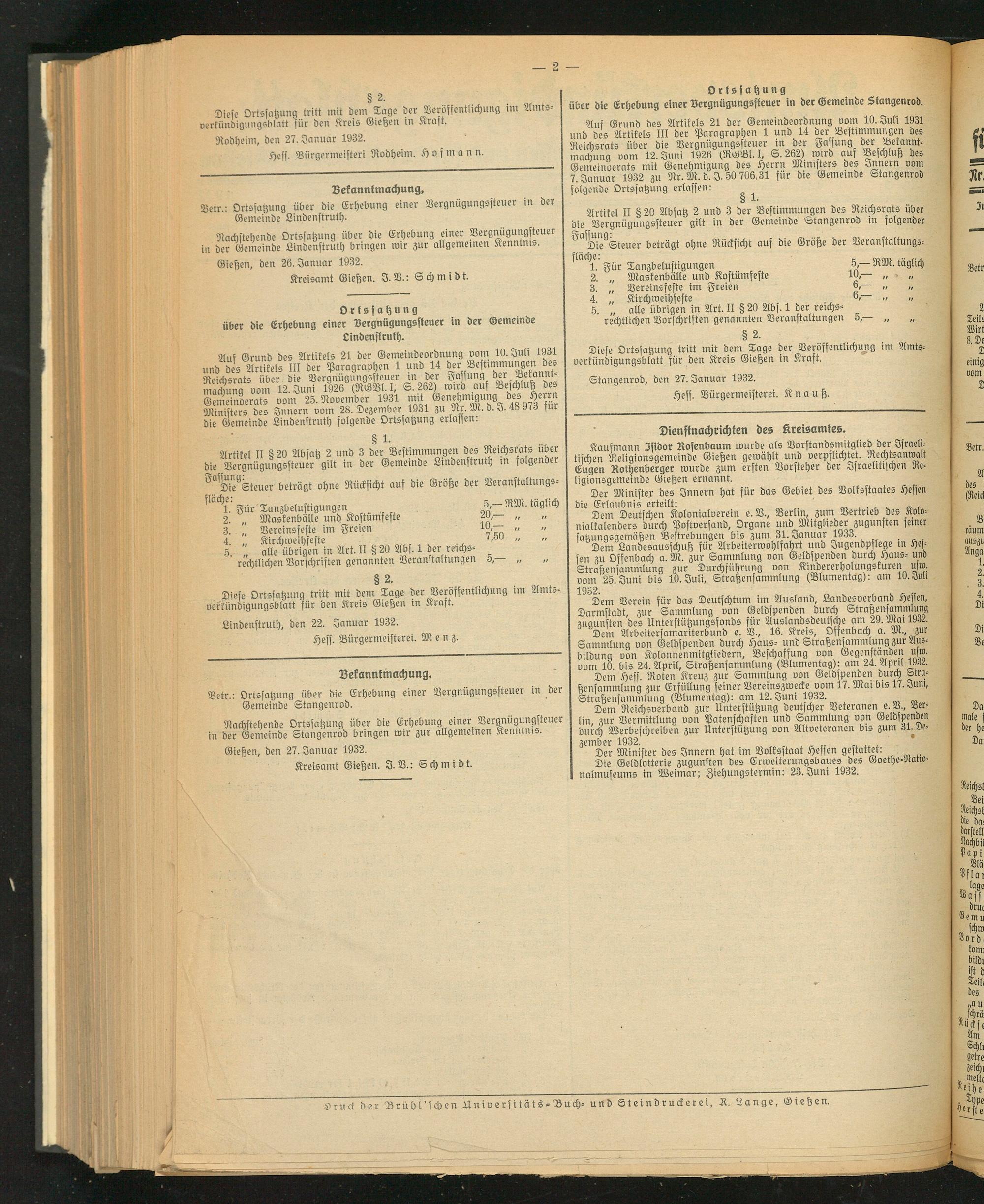 Auf Grund des Artikels 21 der Gemeindeordnung vom 10. Juli 1931 und des Artikels III der Paragraphen 1 und 14 der Bestimmungen des Reichsrats über die Vergnügungssteuer in der Fassung der Bekanntmachung vom 12. Juni 1926 (RGBl. I, S. 262) wird auf Beschluß des Gemeinoerats mit Genehmigung des Herrn Ministers des Innern vom 7. Januar 1932 zu Nr.M. d. J.50 706.31 für die Gemeinde Stangenrod olgende Ortssatzung erlassen: