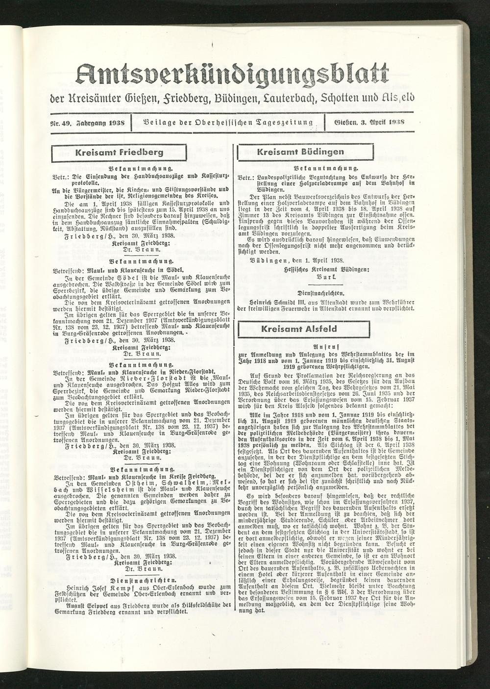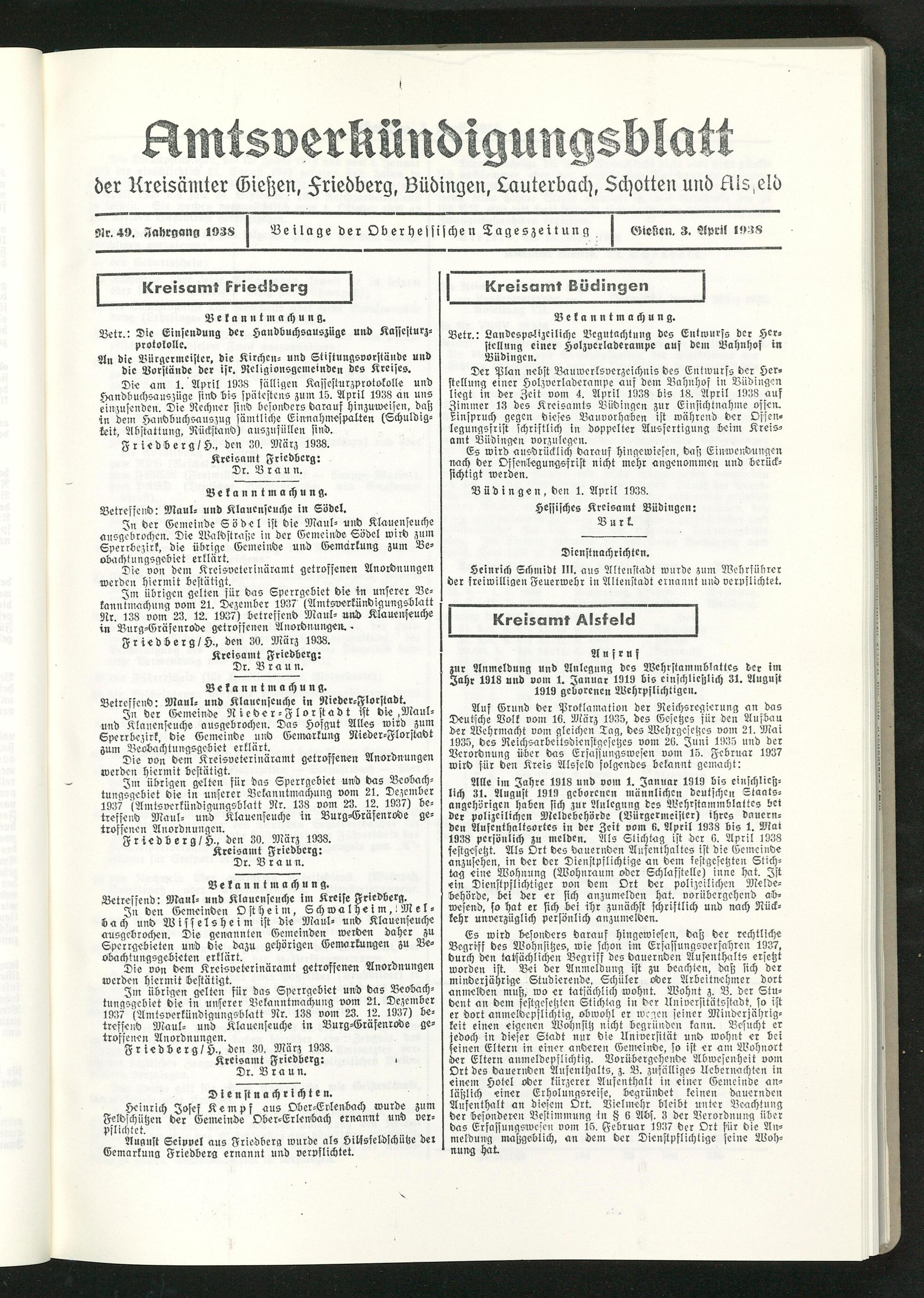 Auf Grund der Proklamation der Reichsregierung an das Deutsche Volk vom 16. März 1935, des Gesetzes für den Aufbau der Wehrmacht vom gleichen Tag, dos Wehrgosetzes vom 21. Mai 1935, des Reichsarbeitsdienstgesetzes vom 26. Juni 1935 und der Verordnung über das Erfassungswesen vom 15. Februar 1937 wirb für den Kreis Alsfeld folgendes bekannt gemacht: