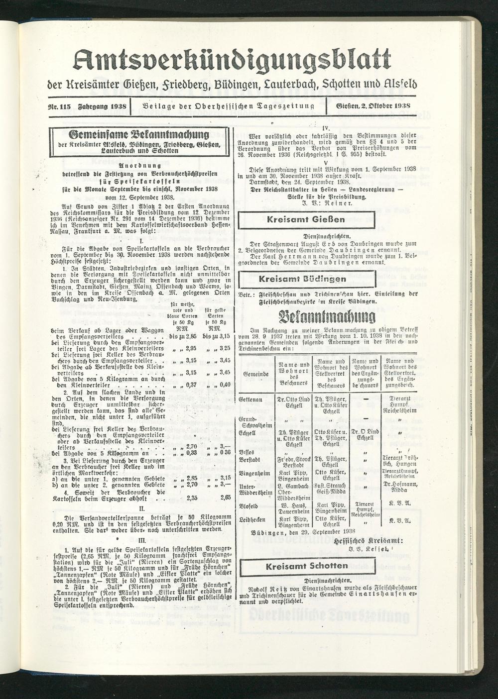 Gemeinsame Bekanntmachung der Kreisämter Alsfelb, Bübingen, Friedberg, Gießen, Lauterbulb und Schotten