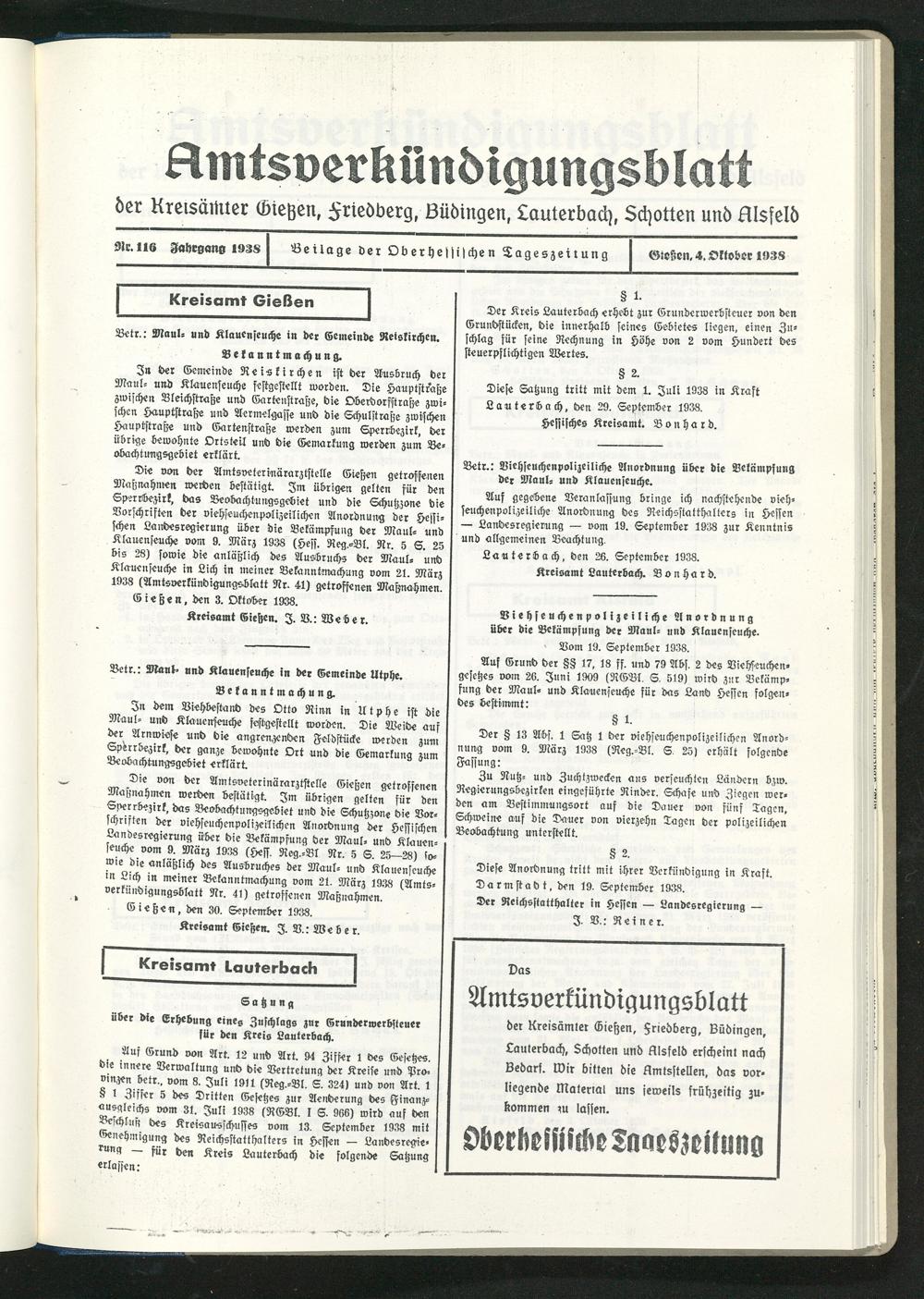 Auf gegebene Veranlassung bringe ich nachstehende viehseuchenpolizeiliche Anordnung des Reichsstatthalters in Hessen — Landesregierung — vom 19. September 1938 zur Kenntnis und allgemeinen Beachtung.