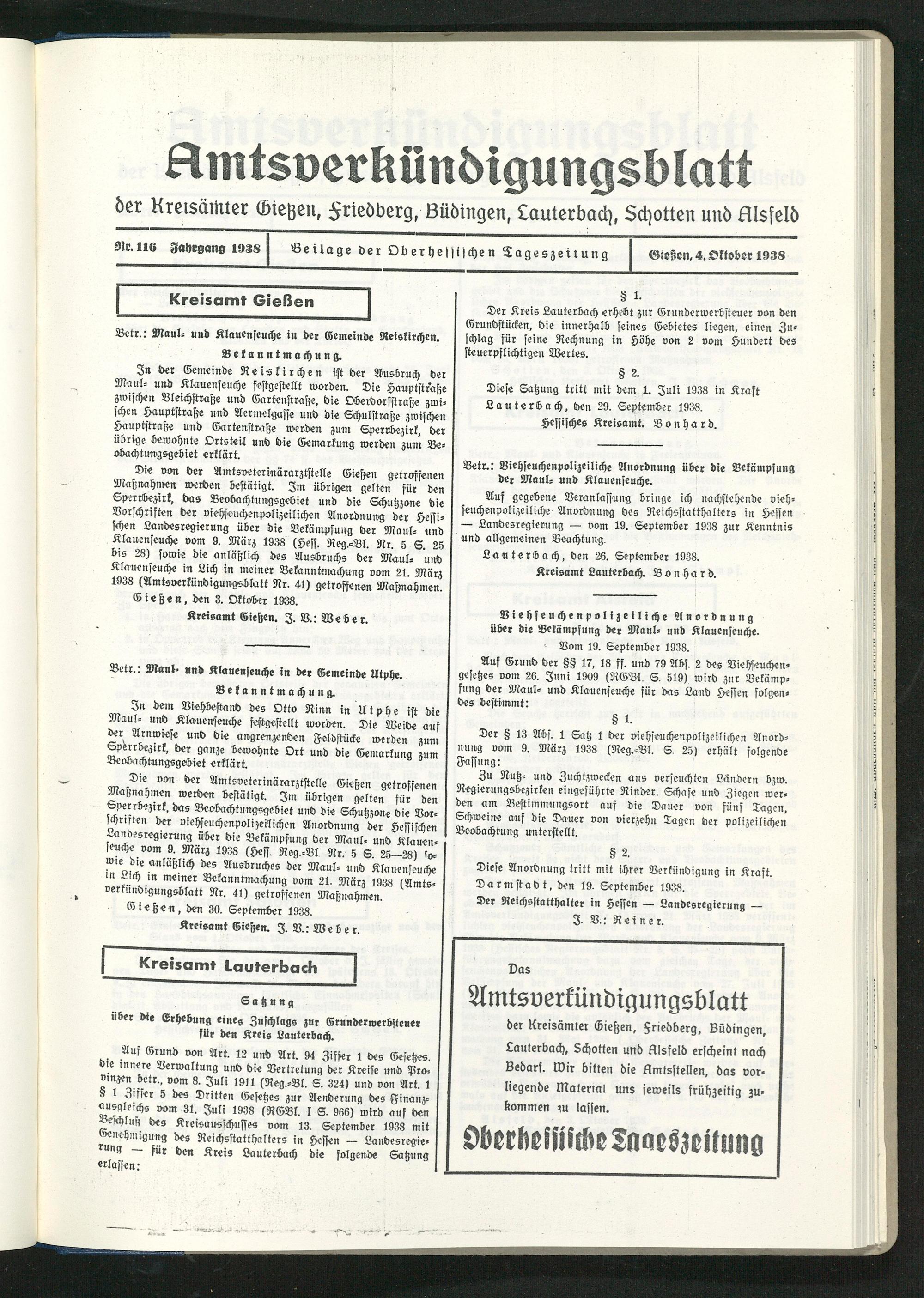 In der Gemeinde Reiskirchen ist der Ausbruch der Maul- und Klauenseuche festgestellt worden. Die Hauptstraße zwischen Bleichstraße und Gartenstraße, die Oberdorfstraße zwischen Hauptstraße und Aermelgasse und die Schulstraße zwischen Hauptstraße und Garteustraße werden zum Sperrbezirk, der übrige bewohnte Ortsteil und die Gemarkung werden zum Be- obachtungsgebiet erklärt.
