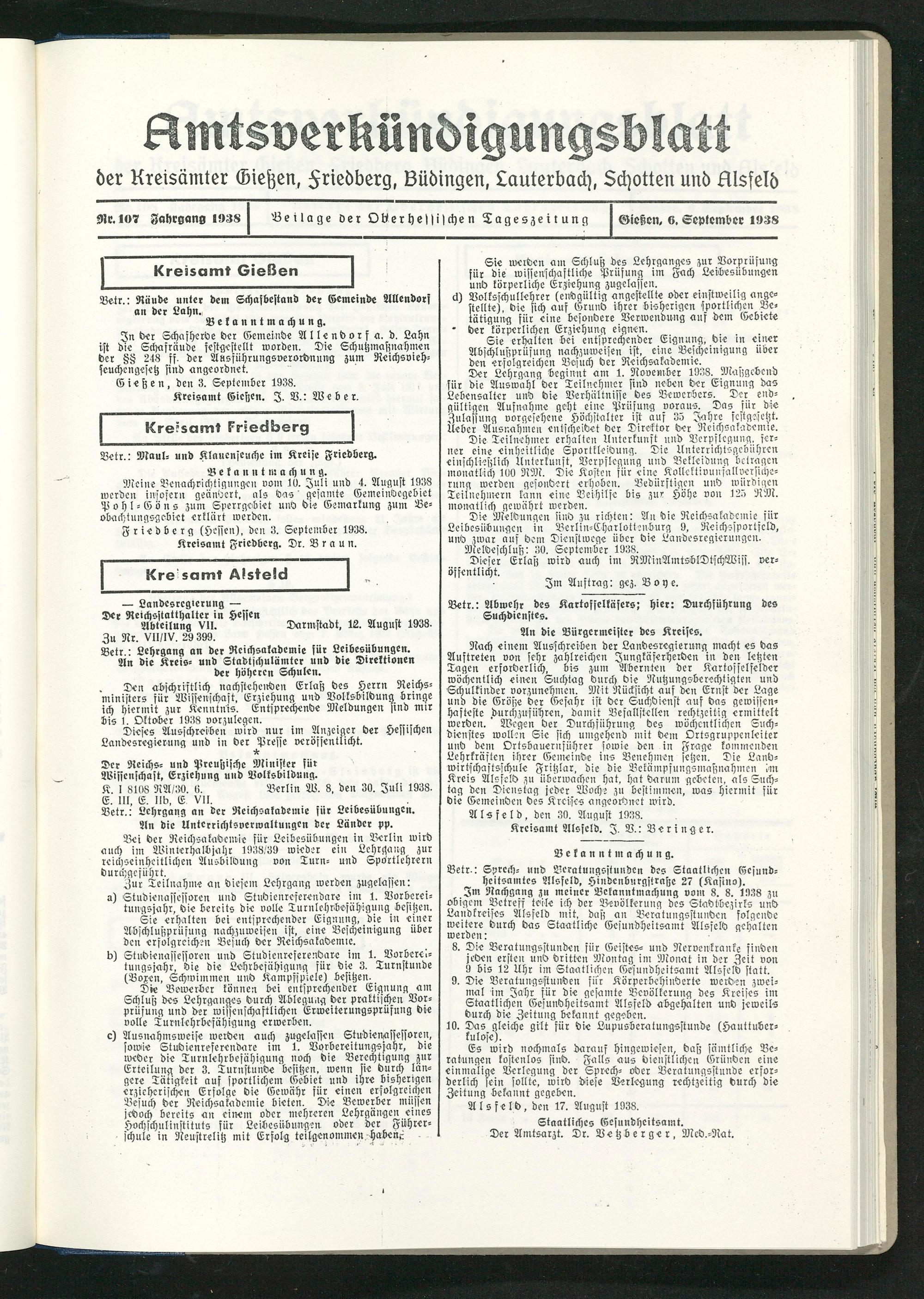 Im Nachgang zu meiner Bekanntmachung vom 8. 8. 1938 zu obigem Betreff teile ich der Bevölkerung des Stadtbezirks und Landkreises Alsfeld mit, daß an Beratungsstunden folgende weitere durch das Staatliche Gesundheitsamt Alsfeld gehalten werden: