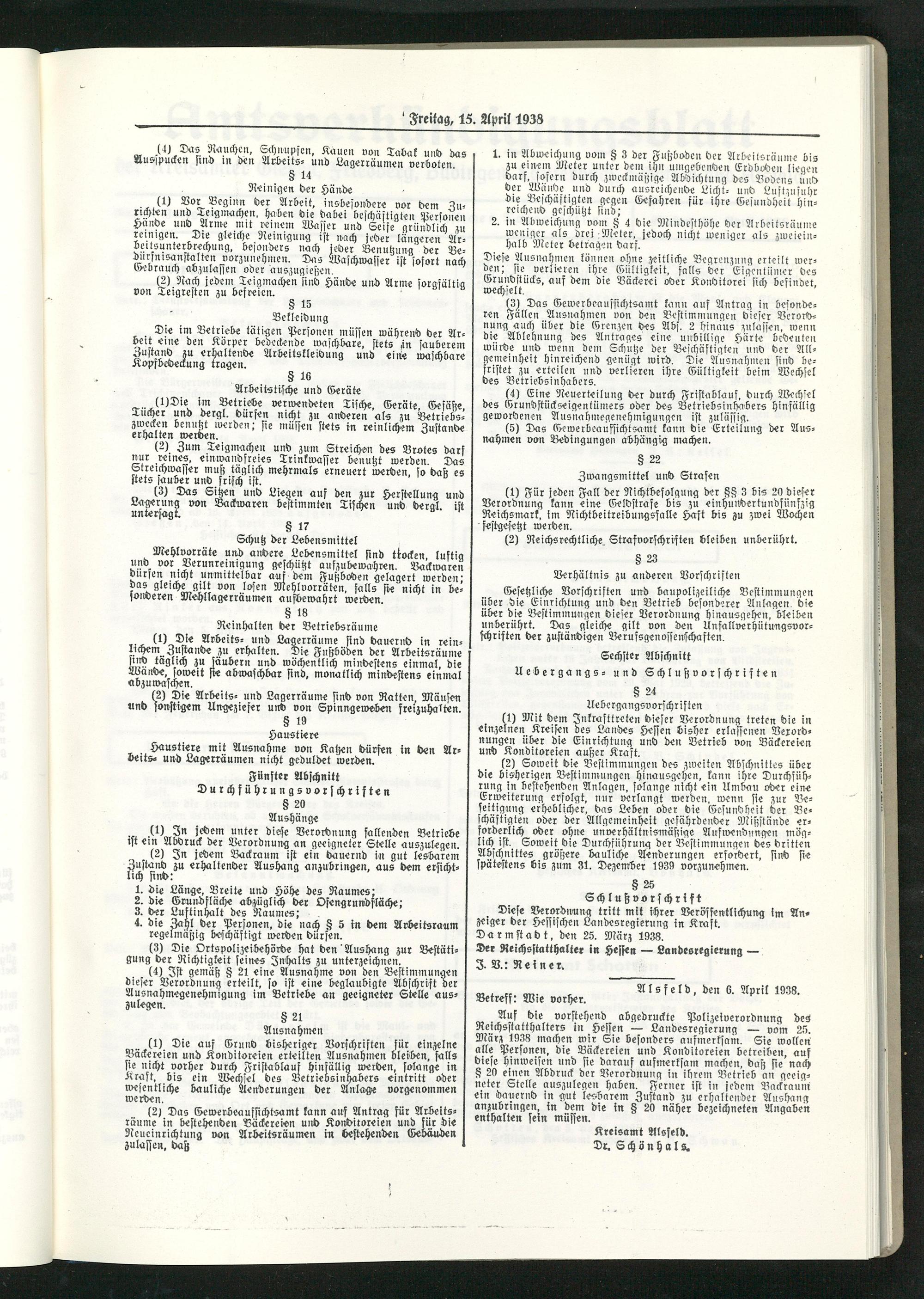 Nuf die vorstehend abgedruckte Polizeiverordnung des Reichsstatthalters in Hessen — Landesregierung — vom 25. März 1938 machen wir Sie besonders aufmerksam. Sie wollen alle Personen, die Bäckereien und Konditoreien betreiben, auf diese Hinweisen und sie darauf aufmerksam machen, daß sie nach § 20 einen Abdruck der Verordnung in ihrem Betrieb an geeigneter Stelle ausznlegen haben. Ferner ist in jedem Vackrau'm ein dauernd in gut lesbarem Zustand zu erhaltender Aushang anzubringen, in dem die in § 20 näher bezeichneten Angaben enthalten sein müssen.