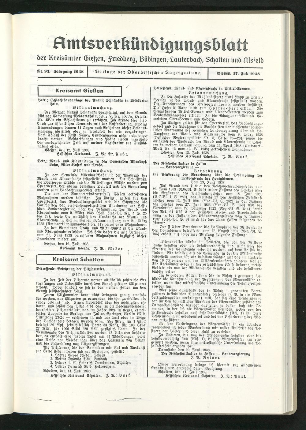 Im übrigen gelten für den Sperrbezirk, das Beobachtungsgebiet und die Schutzzone die Vorschriften der viehseuchenpolizeilichen Anordnung der Hessischen Landesregierung über die Bekämpfung der Maul- und Klauenseuche vom 9. März 1938 (Hessisches Regierungsblatt Nr. 5, Seite 25—28), sowie die anläßlich des Ausbruchs der Maul- und Klauenseuche in Schotten in meiner Vekanntmarhung vom 11. April 1938 lAmtsverk.- Vlatt Nr. 15 vom 13. IV. 1938) getroffenen Maßnahmen