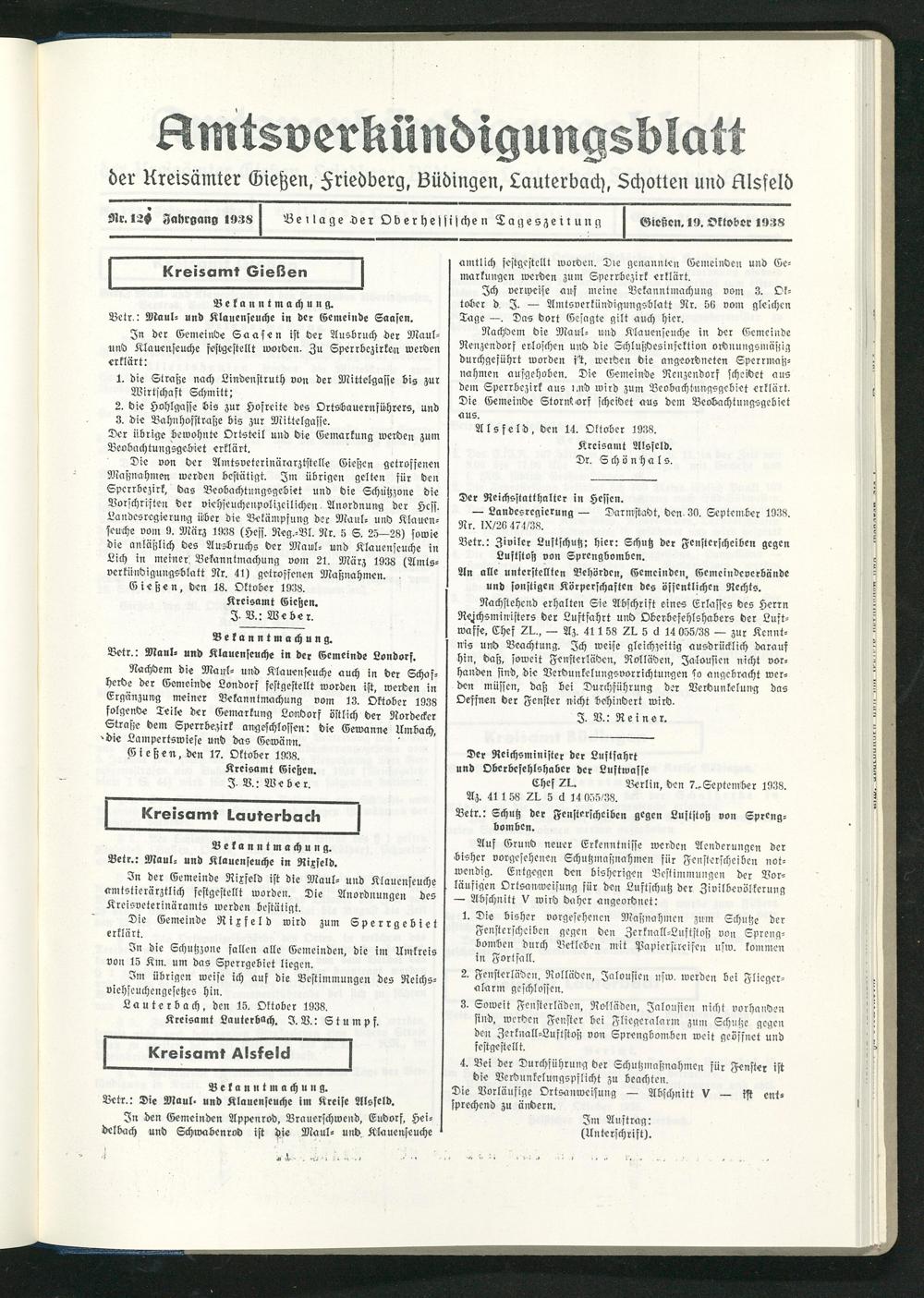 Nachdem die Maul« und Klauenseuche auch in der Schafherde der Gemeinde Londorf festgestellt worden ist, werden in Ergänzung meiner Bekanntmachung vom 13. Oktober 1938 folgende Teile der Gemarkung Londorf östlich der Nordeckcr Straße dem Sperrbezirk angeschlossen: die Gewanne Umbach 'Wc Lampertswiese und das Gewänn.
