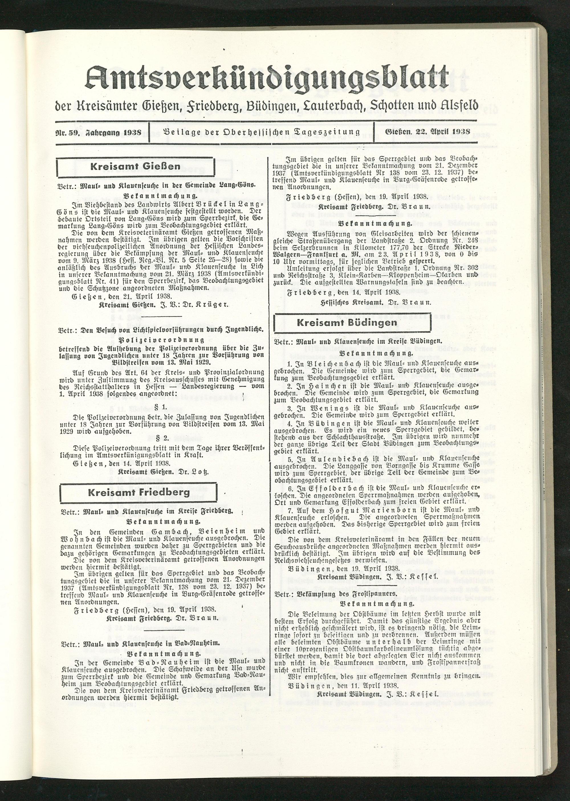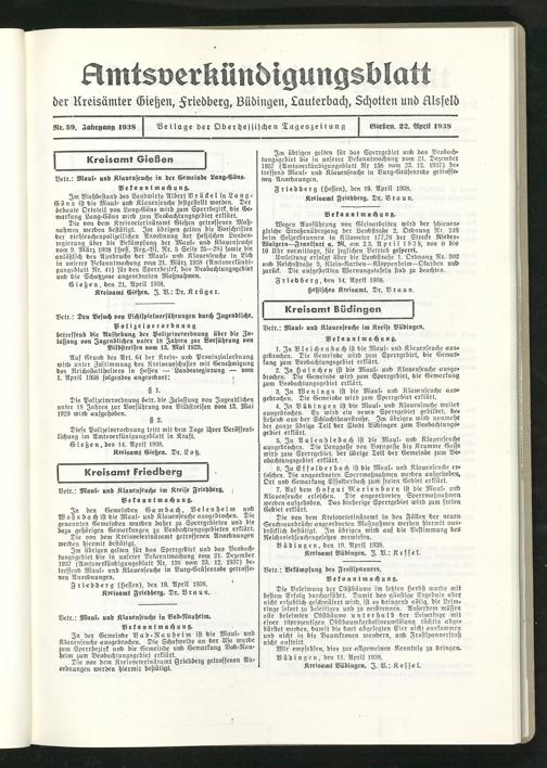 In den Gemeinden Gambach, Beienheim und Wohnbach ist die Maul- und Klauenseuche ausgebrochen. Die genannten Gemeinden wurden daher zu Sperrgebieten und hie dazu gehörigen Gemarkungen zu Veobachtungsgebieten erklärt.
