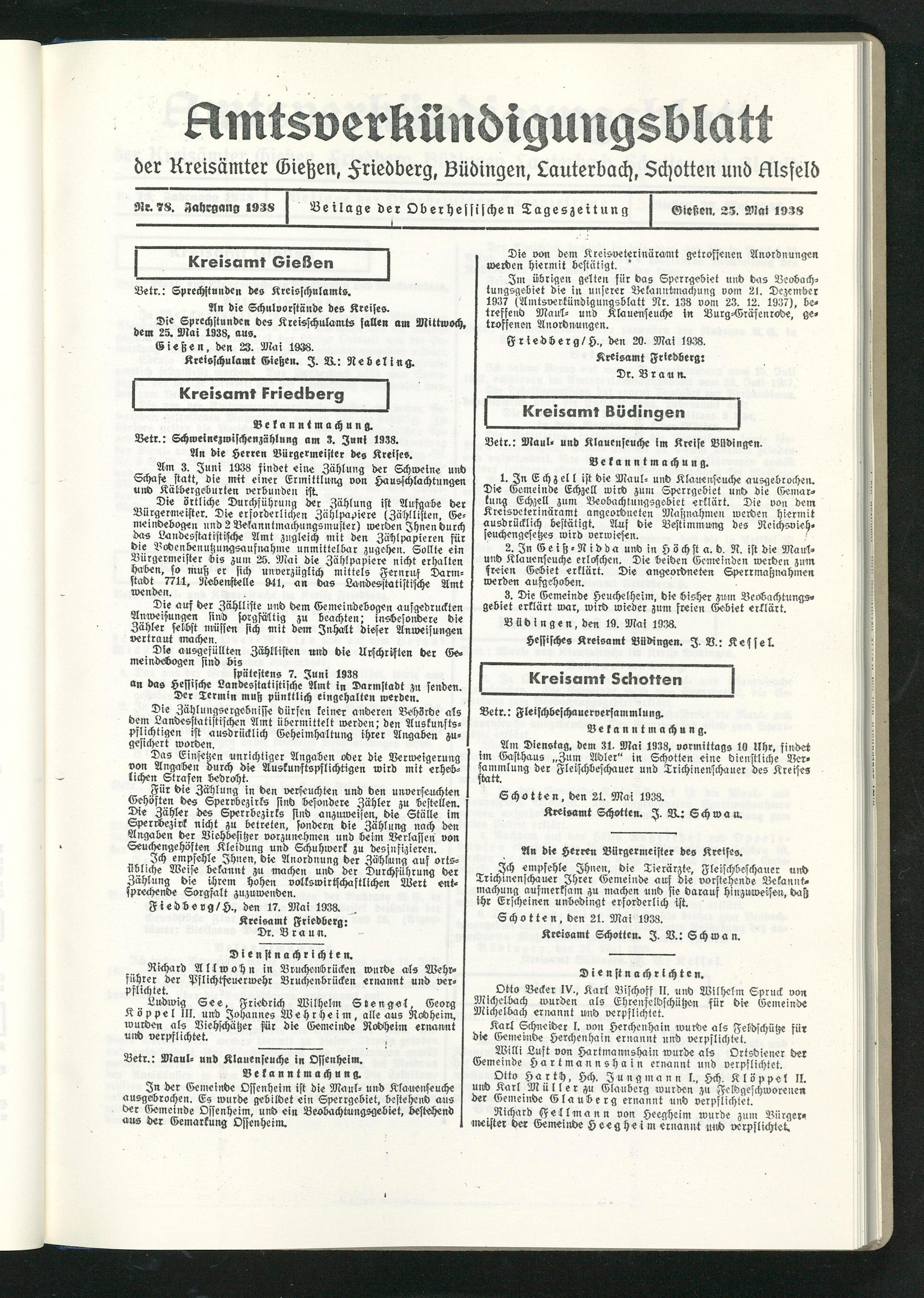 Am Dienstag, dem 31. Mai 1938, vormittags 10 Uhr, findet im Gasthaus „Zum Adler" in Schotten eine dienstliche Versammlung der Fleifchbefchauer und Trichinenschauer des Kreises statt.