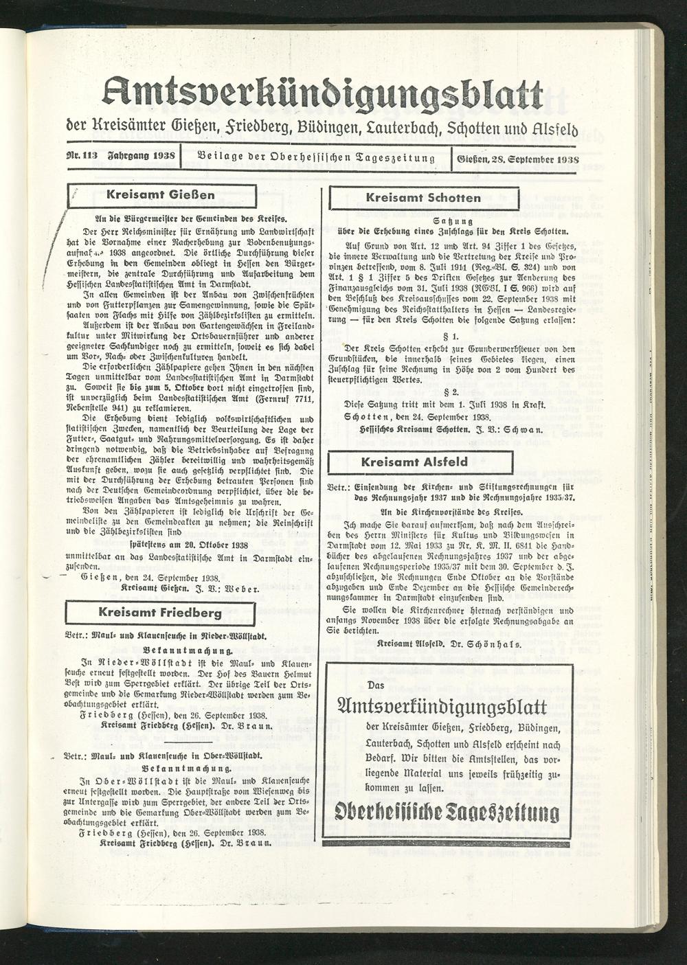 der Kreisämter Gießen, $riebberg, Bübingen, Lauterbach, Schotten und fllsfelb erscheint nach Bebarf. Wir bitten bie Zmtsstellen, bas vor- liegenbe Material uns jeweils frühzeitig zukommen zu lassen.