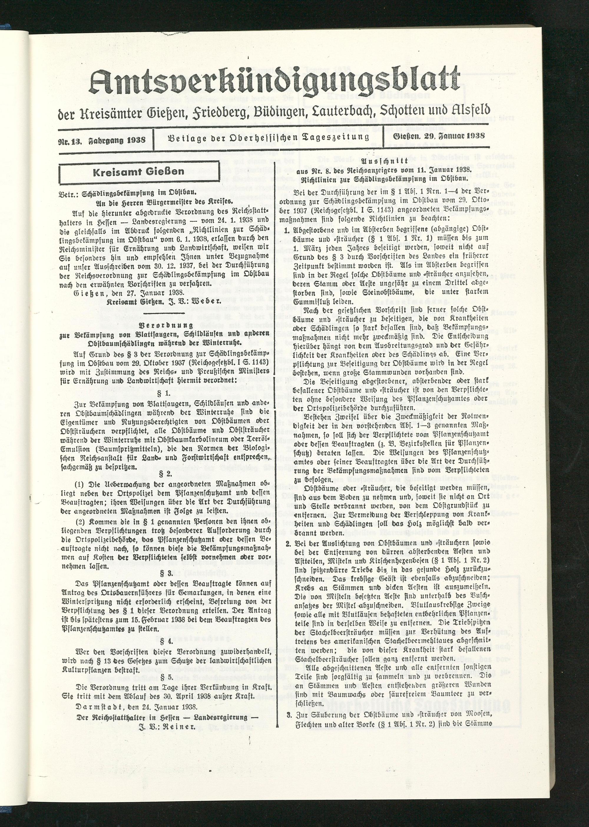 aus Nr. 8. des Reichsanzeigers vom 11. Januar 1938. Richtlinien zur Schädlingsbekämpfung im Obstbau.