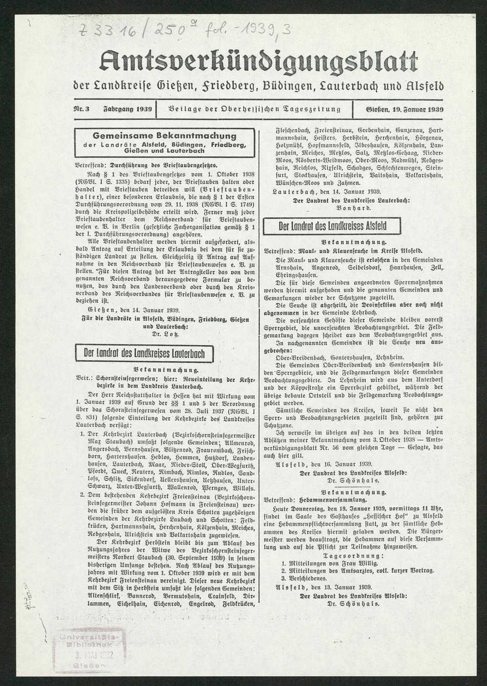 Heute Donnerstag, den 19. Januar 1939, vormittags 11 Uhr, findet im Saale des Gasthauses „Hessischer Hof" zu Alsfeld eine Hebamntenpflichtversainmlung statt, zu der sämtliche Hebammen des Kreises hiermit geladen werden. Die Bürgermeister werden beauftragt, die Hebammen auf diese Versammlung und aus die Pflicht zur Teilnahme hinzuweisen.