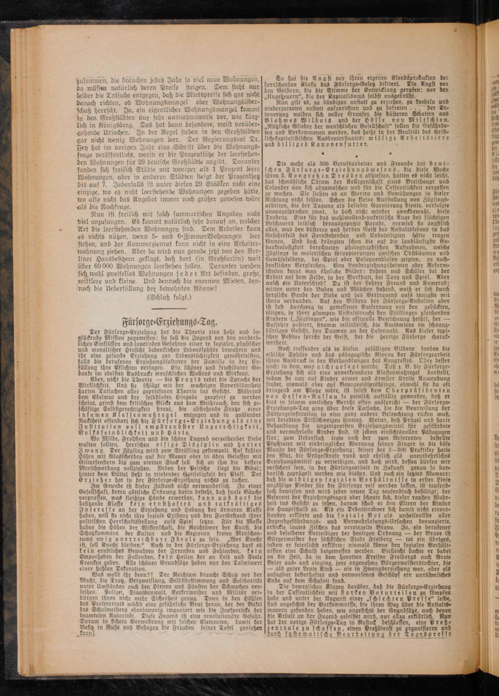 Der Fürsorge⸗Erziehung hat die Theorie eine hohe und be⸗ glückende Mission zugemessen: sie soll die Jugend vor den verderb— lichen Einflüssen und lauernden Gefahren einer in sozlaler, physischer und moralischer Hinsicht bedenklichen Lebenssphäre bewahren und ihr eine gesunde Erz nehung zur Lebenstüchtigkeit gewährleisten, falls die berufenen Erziehung jsfalto hren der Familie in der Er füllung ihre Pflichten versagen. Ein schöner und fruchtbarer Ge— danke im edelsten Ausdrucke menschlichen Wollens und Wirkens.