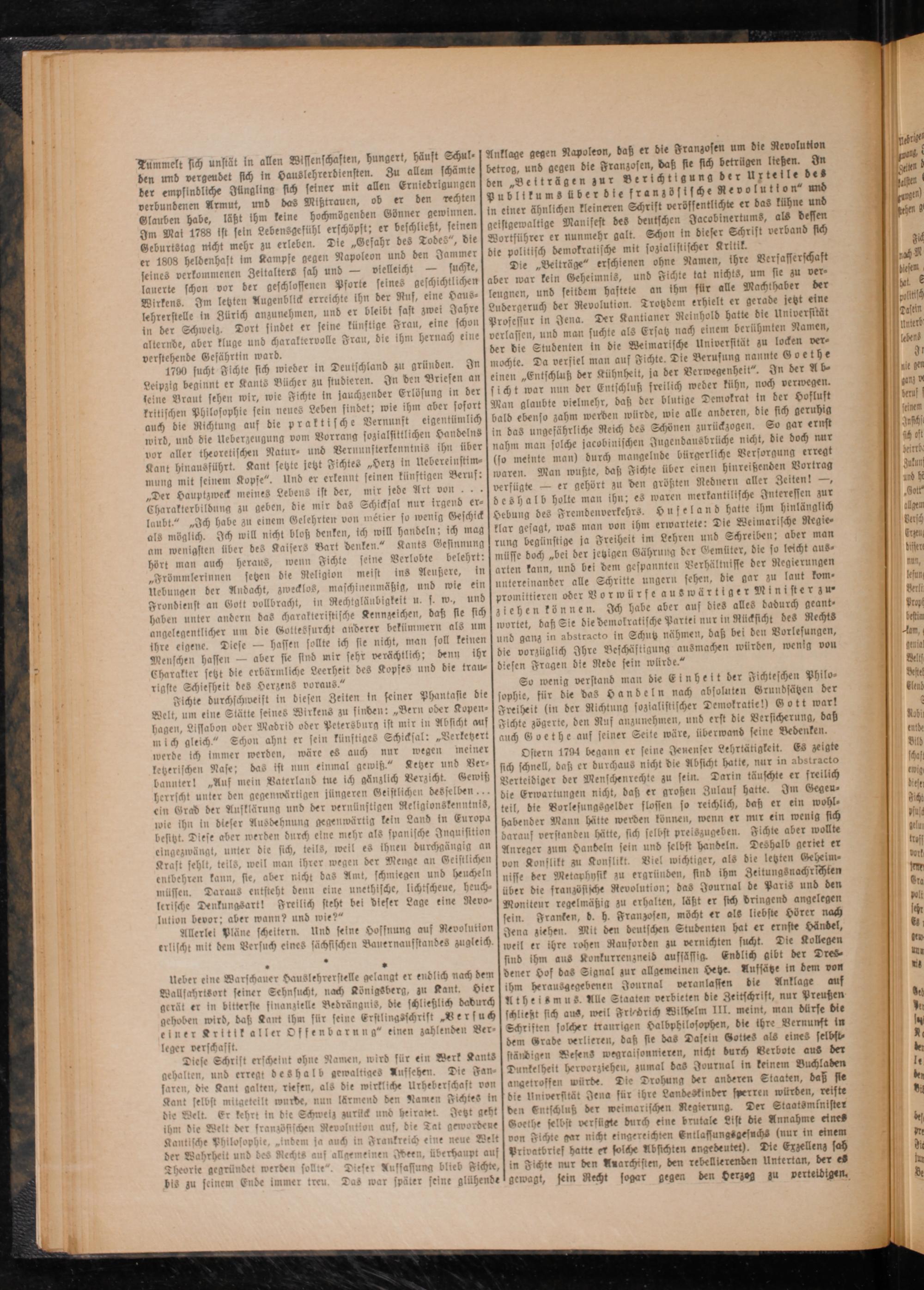 Anklage gegen Napoleon, daß er die Franzosen um die Revolution betrog, und gegen die Franzosen, daß sie sich betrügen ließen. In den„Beiträgen zur Berichtigung der Urteile des publikums über die französische Revolution“ und in einer ähnlichen kleineren Schrift veröffentlichte er das kühne und geistgewaltige Manifest des deutschen Jacobinertums, als dessen Wortführer er nunmehr galt. Schon in dieser Schrift verband sich die politisch demokratische mit sozialistischer Kritik.